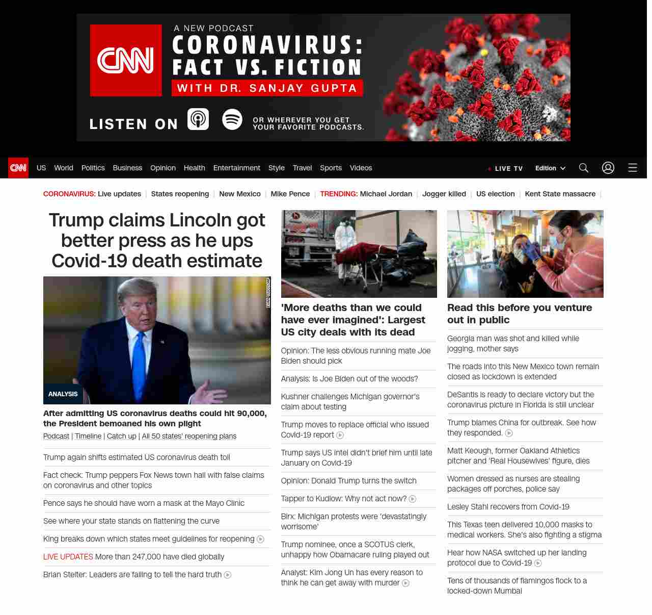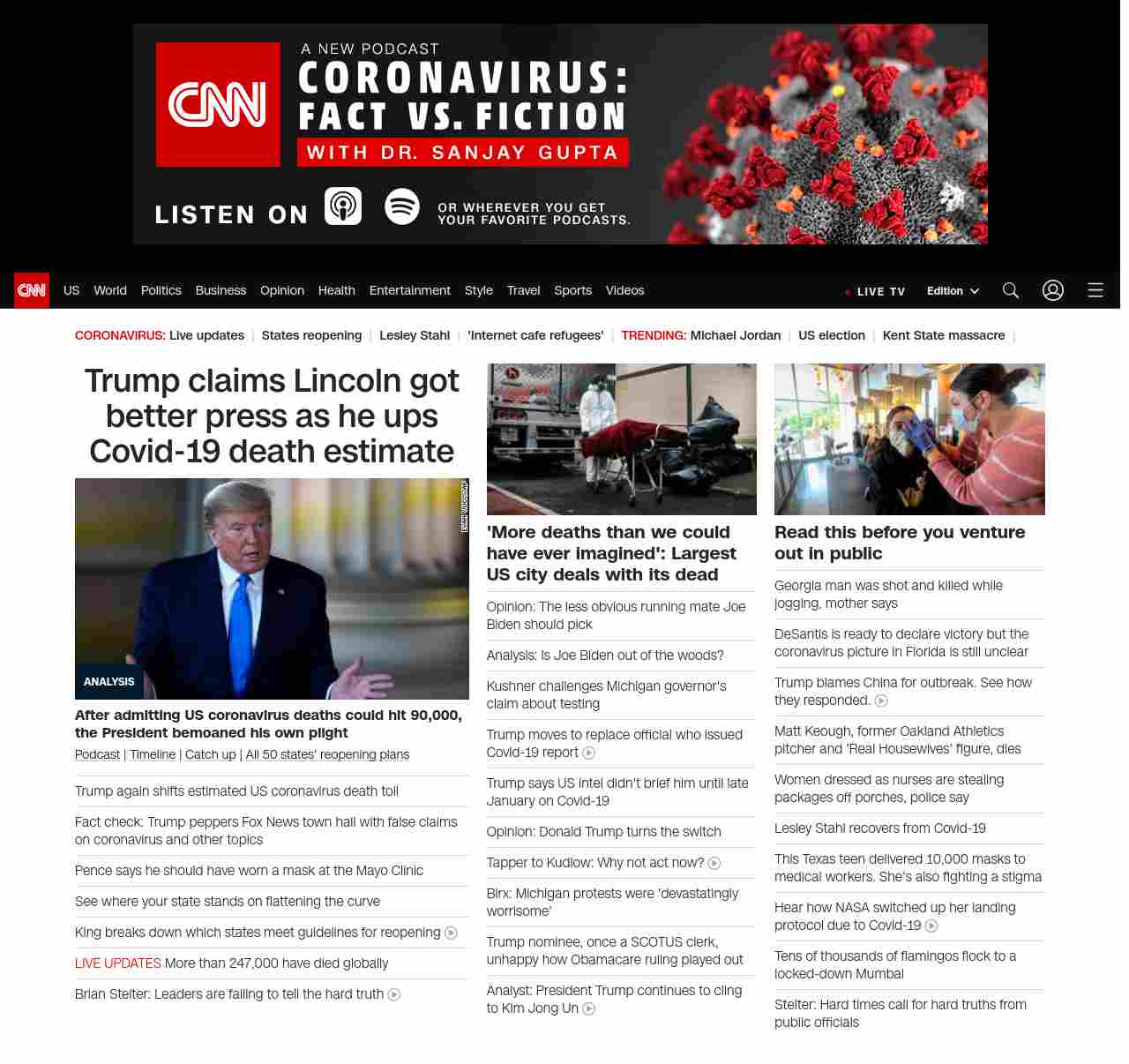 || screaming-banner-text banner-text-size–char-47″ data-analytics=”_list-hierarchical-xs_article_”> Trump claims Lincoln got better press as he ups Covid-19 death estimate ||” , title: “CNN – Breaking News, Latest News and Videos” , siblings: {“articleList”:[{“uri”:”/2020/05/04/politics/trump-lincoln-press-treatment-deaths/index.html”,”headline”:”After admitting US coronavirus deaths could hit 90,000 the President bemoaned his own plight “,”thumbnail”:”//cdn.cnn.com/cnnnext/dam/assets/200503205539-01-trump-fox-town-hall-small-11.jpg”,”duration”:””,”description”:”u003ca href=”https://www.cnn.com/audio/podcasts/corona-virus” target=”_blank”>Podcastu003c/a> | u003ca href=”https://www.cnn.com/interactive/2020/health/covid19-pandemic-video-timeline/index.html” target=”_blank”>Timelineu003c/a> | u003ca href=”http://www.cnn.com/2020/05/03/world/coronavirus-newsletter-05-03-20/index.html” target=”_blank”>Catch upu003c/a> | u003ca href=”https://www.cnn.com/interactive/2020/us/states-reopen-coronavirus-trnd/” target=”_blank”>All 50 states’ reopening plansu003c/a>”,”layout”:””