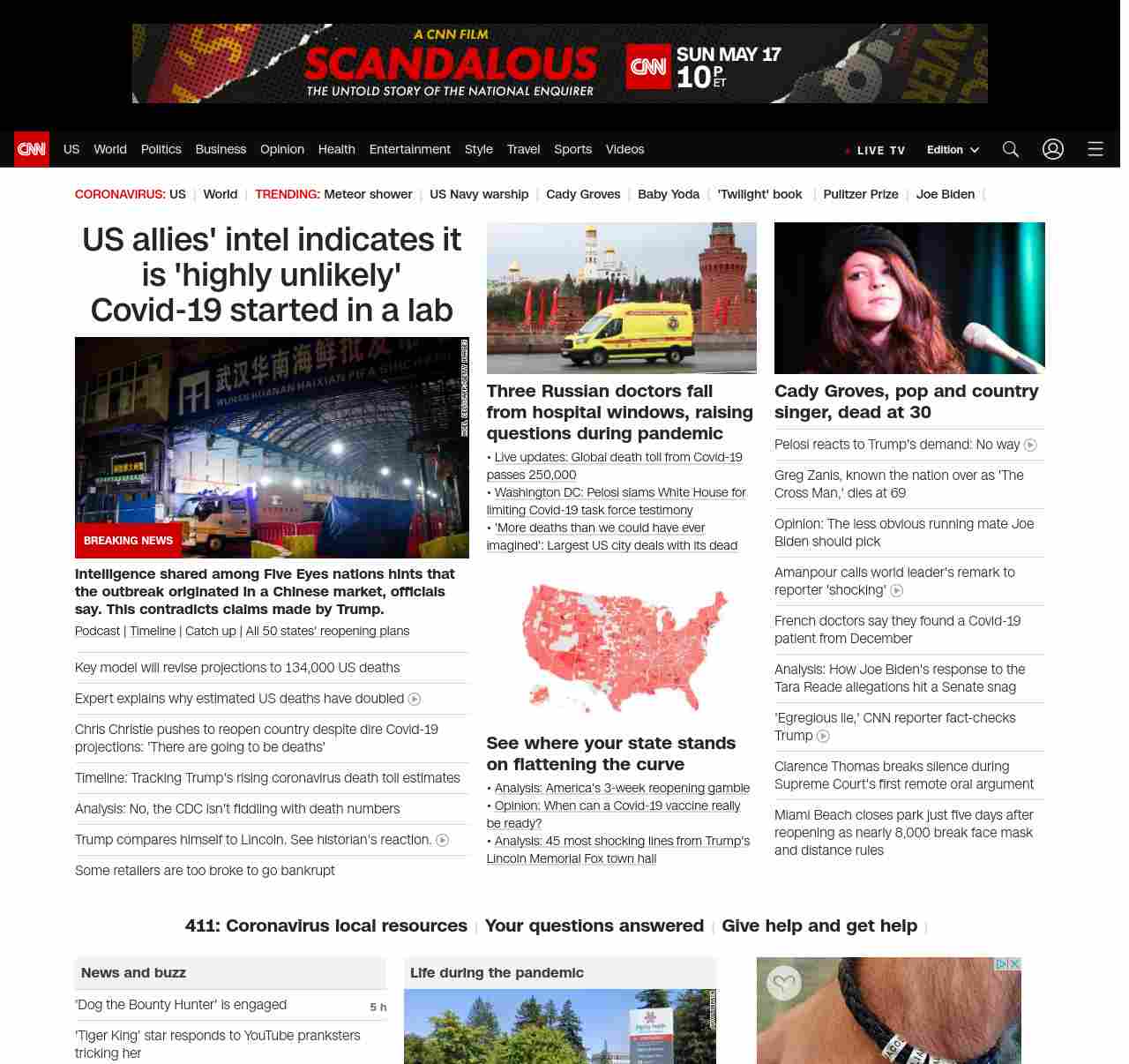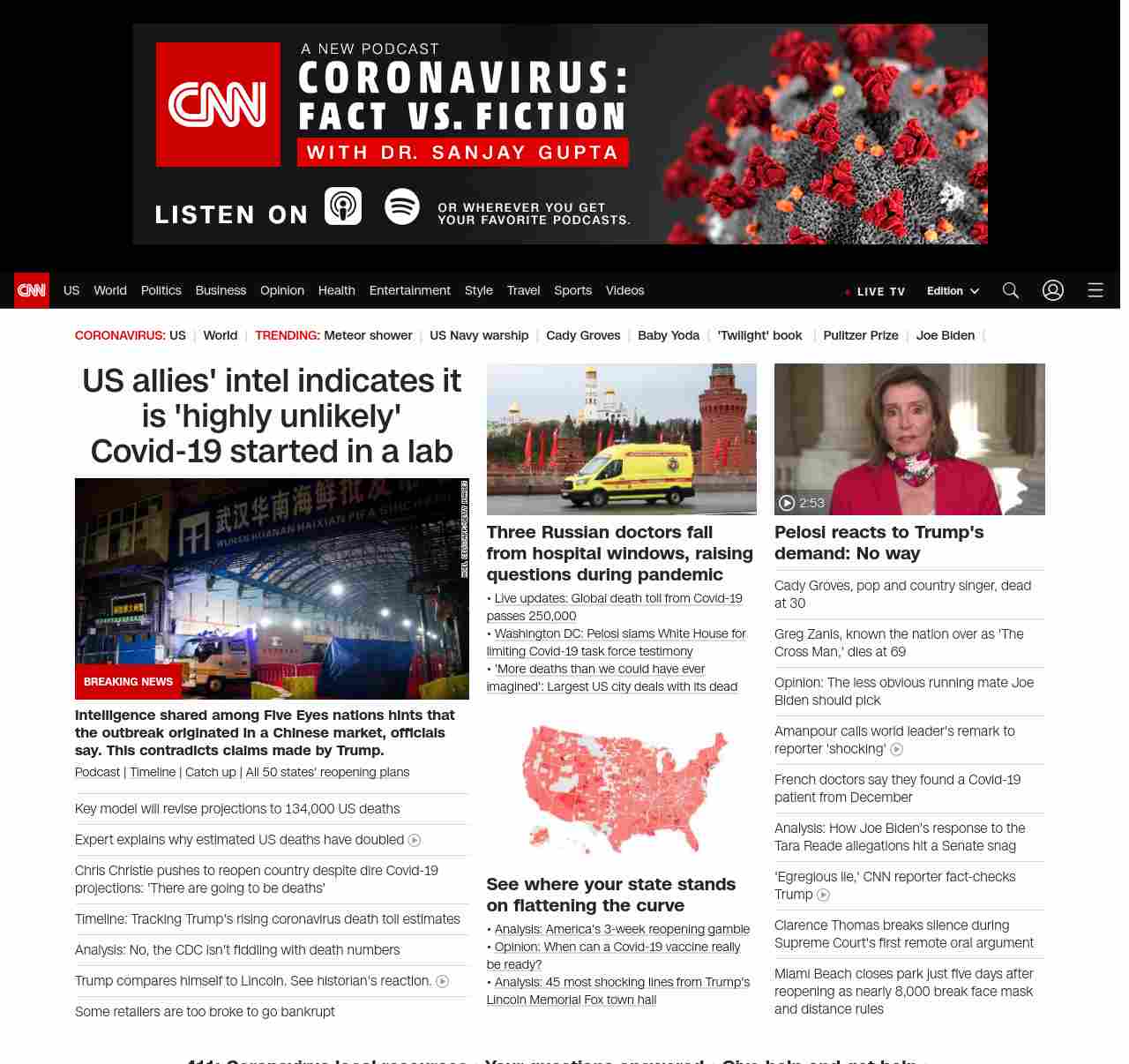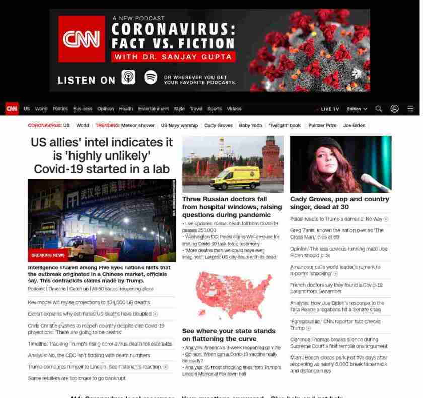 || screaming-banner-text banner-text-size–char-47″ data-analytics=”_list-hierarchical-xs_hyperlink_”> Key model will revise projections to 134,000 US deaths ||” , title: “CNN – Breaking News, Latest News and Videos” , siblings: {“articleList”:[{“uri”:”/2020/05/04/politics/coronavirus-intelligence/index.html”,”headline”:”u003cstrong>Intelligence shared among Five Eyes nations hints that the outbreak originated in a Chinese market, officials say. This contradicts claims made by Trump.u003c/strong>”,”thumbnail”:”//cdn.cnn.com/cnnnext/dam/assets/200127165502-wuhan-seafood-market-jan-11-small-11.jpg”,”duration”:””,”description”:”u003ca href=”https://www.cnn.com/audio/podcasts/corona-virus” target=”_blank”>Podcastu003c/a> | u003ca href=”https://www.cnn.com/interactive/2020/health/covid19-pandemic-video-timeline/index.html” target=”_blank”>Timelineu003c/a> | u003ca href=”https://www.cnn.com/2020/05/04/world/coronavirus-newsletter-05-04-20-intl/index.html” target=”_blank”>Catch upu003c/a> | u003ca href=”https://www.cnn.com/interactive/2020/us/states-reopen-coronavirus-trnd/” target=”_blank”>All 50 states’ reopening plansu003c/a>”,”layout”:””