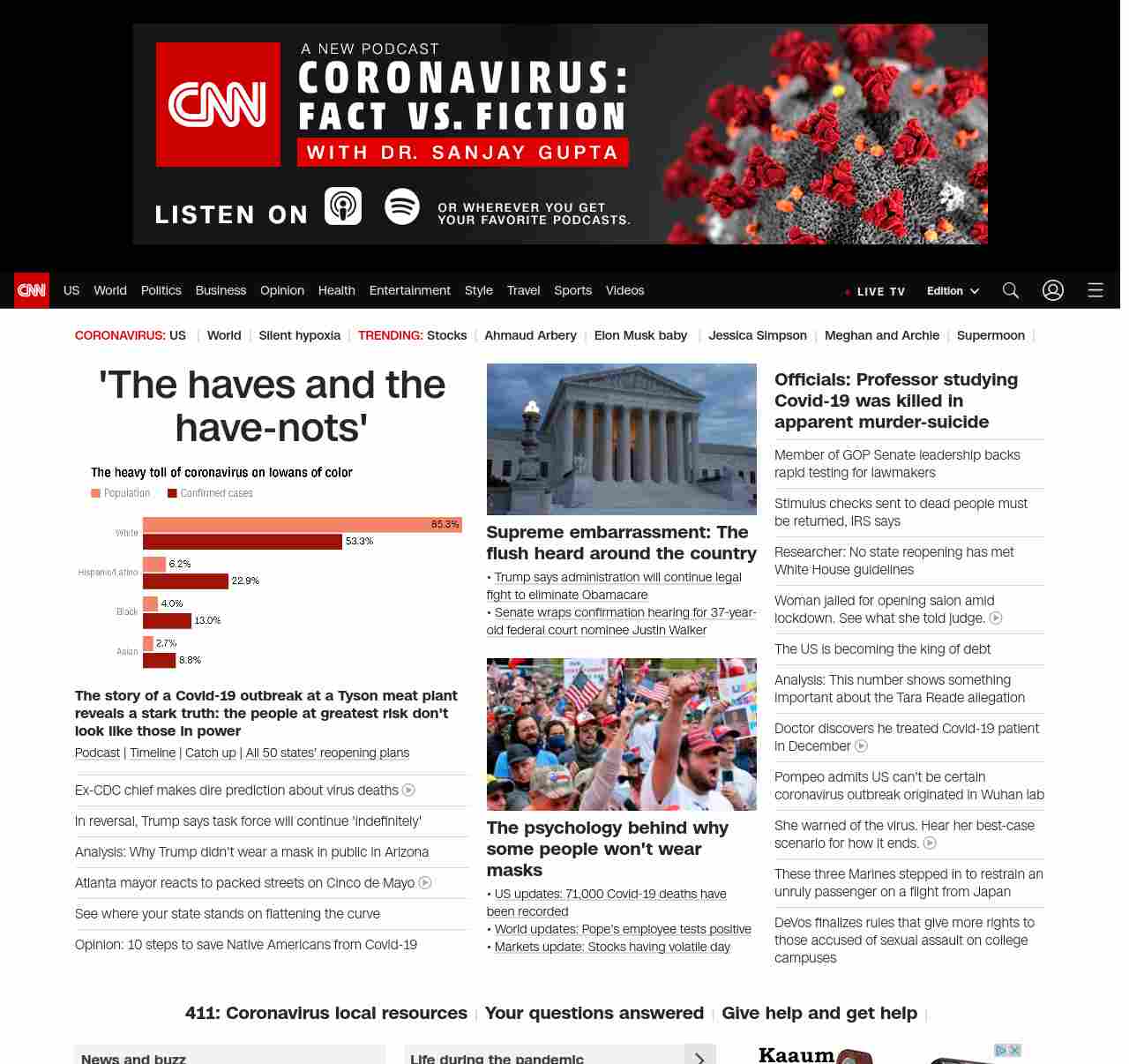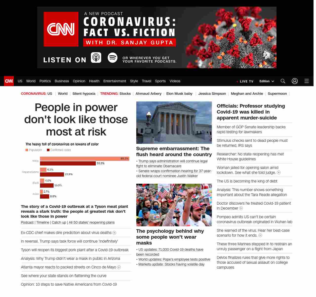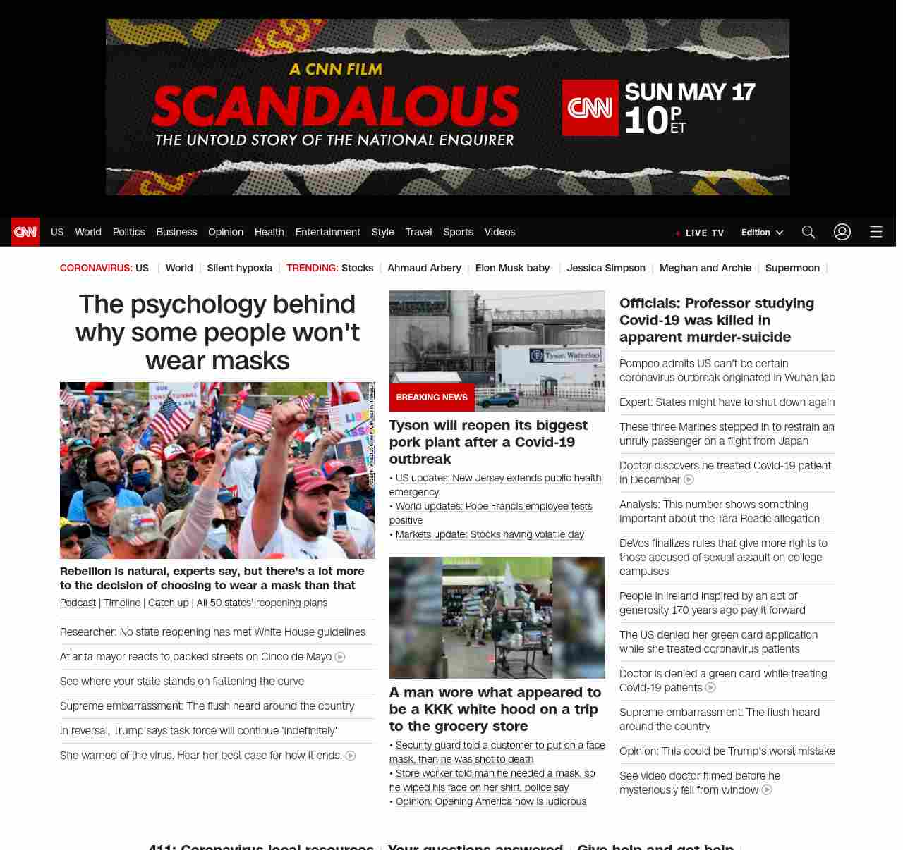|| screaming-banner-text banner-text-size–char-47″ data-analytics=”_list-hierarchical-xs_article_”> The psychology behind why some people won’t wear masks ||” , title: “CNN – Breaking News, Latest News and Videos” , siblings: {“articleList”:[{“uri”:”/2020/05/06/politics/black-leaders-confront-covid-19/index.html”,”headline”:”u003cstrong>The story of a Covid-19 outbreak at a Tyson meat plant reveals a stark truth: the people at greatest risk don’t look like those in poweru003c/strong>”,”thumbnail”:”//cdn.cnn.com/cnnnext/dam/assets/200506141443-hp-only-20200506-iowa-cases-small-11.png”,”duration”:””,”description”:”u003ca href=”https://www.cnn.com/audio/podcasts/corona-virus” target=”_blank”>Podcastu003c/a> | u003ca href=”https://www.cnn.com/interactive/2020/health/covid19-pandemic-video-timeline/index.html” target=”_blank”>Timelineu003c/a> | u003ca href=”https://www.cnn.com/2020/05/06/world/coronavirus-newsletter-05-06-20-intl/index.html” target=”_blank”>Catch upu003c/a> | u003ca href=”https://www.cnn.com/interactive/2020/us/states-reopen-coronavirus-trnd/” target=”_blank”>All 50 states’ reopening plansu003c/a>u003cbr />”,”layout”:””