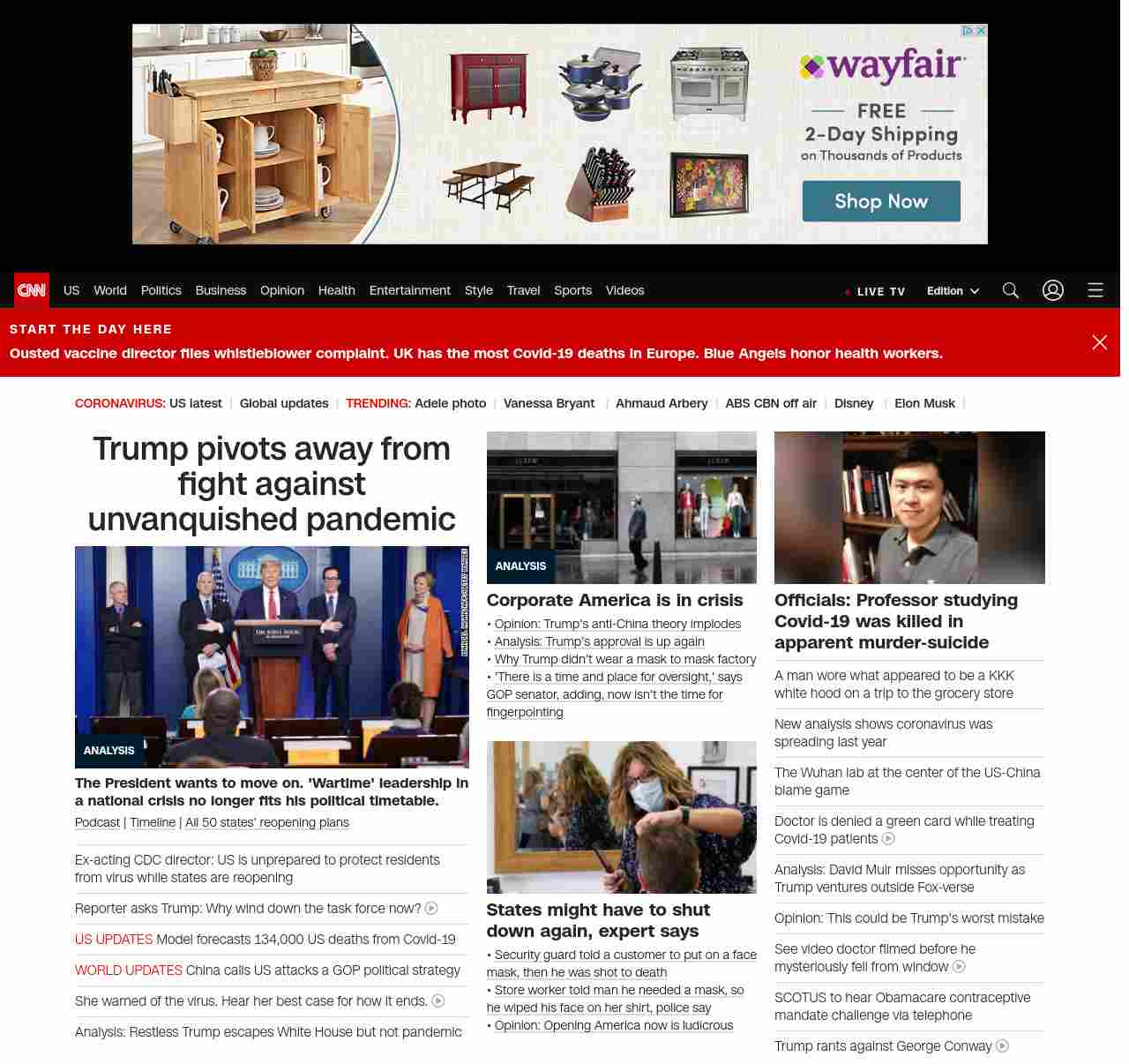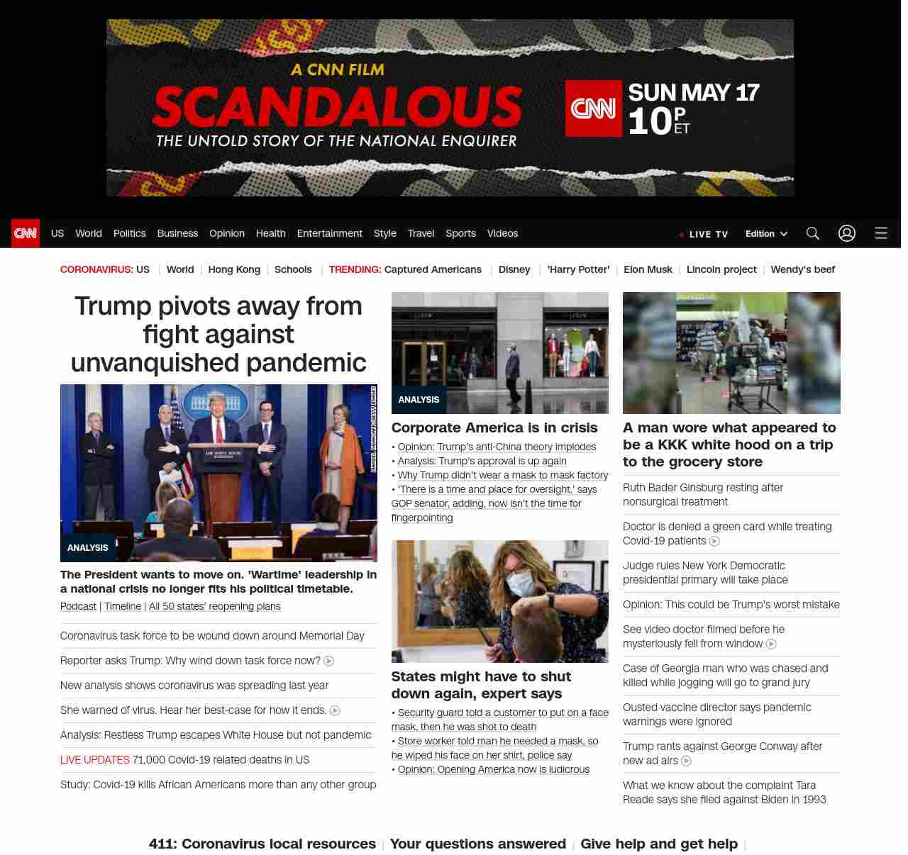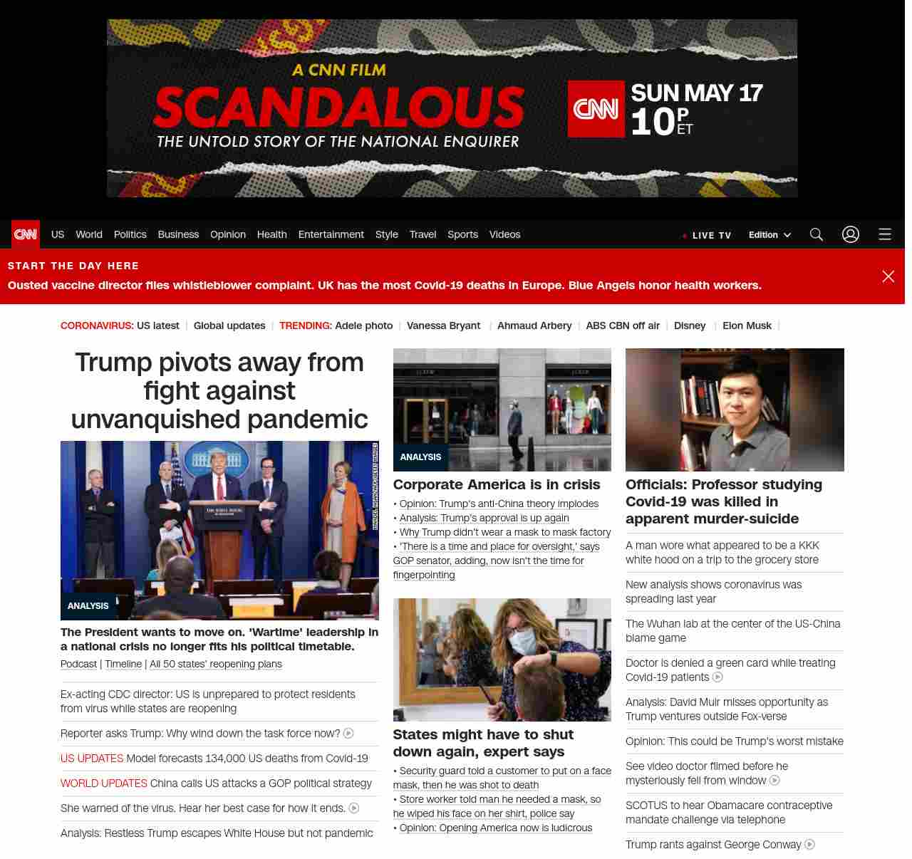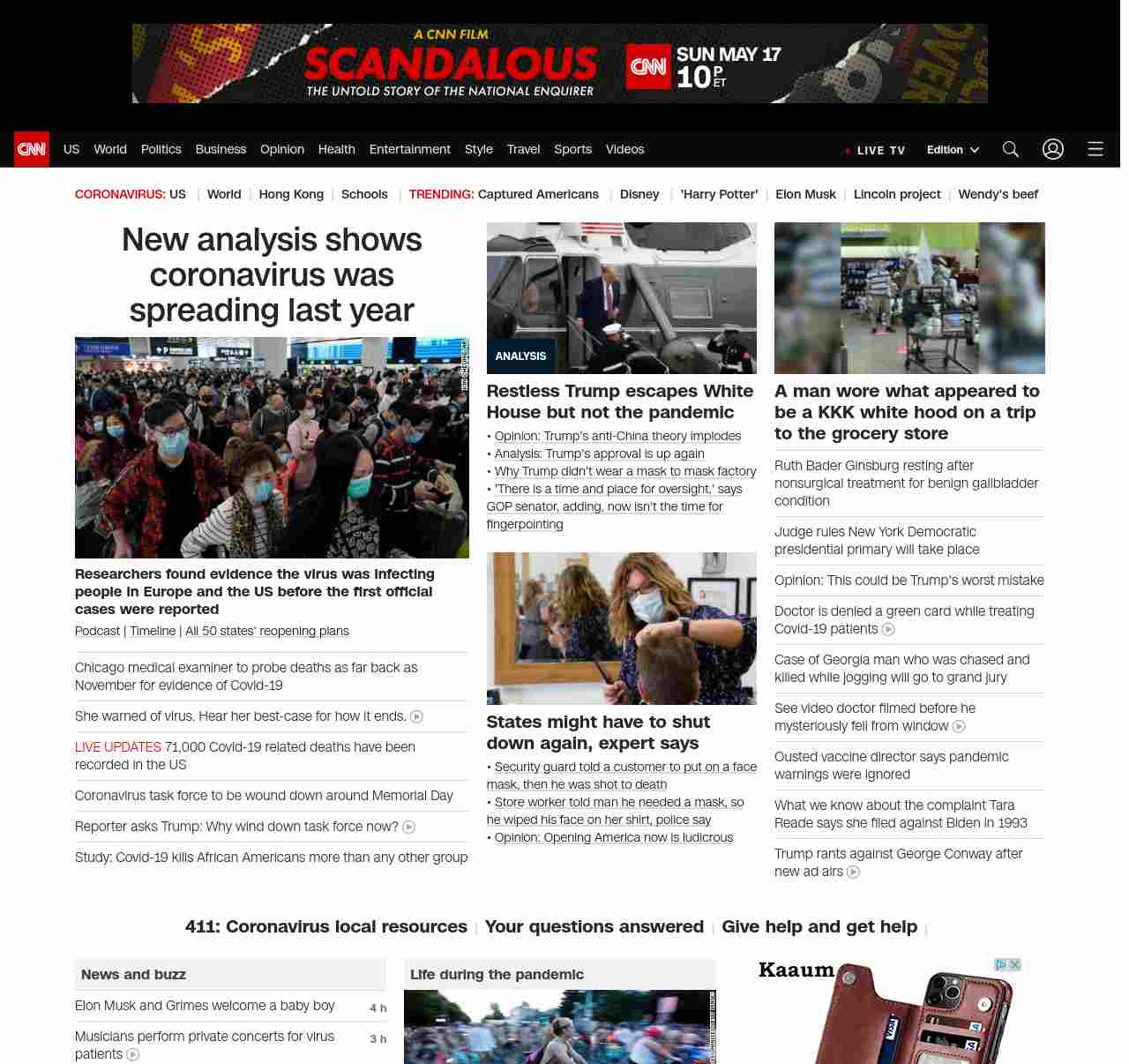 || screaming-banner-text banner-text-size–char-47″ data-analytics=”_list-hierarchical-xs_hyperlink_”> New analysis shows coronavirus was spreading last year ||” , title: “CNN – Breaking News, Latest News and Videos” , siblings: {“articleList”:[{“uri”:”/2020/05/06/politics/donald-trump-coronavirus/index.html”,”headline”:”u003cstrong>The President wants to move on. ‘Wartime’ leadership in a national crisis no longer fits his political timetable.u003c/strong>”,”thumbnail”:”//cdn.cnn.com/cnnnext/dam/assets/200505150639-02-coronavirus-task-force-briefing-0325-small-11.jpg”,”duration”:””,”description”:”u003ca href=”https://www.cnn.com/audio/podcasts/corona-virus” target=”_blank”>Podcastu003c/a> | u003ca href=”https://www.cnn.com/interactive/2020/health/covid19-pandemic-video-timeline/index.html” target=”_blank”>Timelineu003c/a> | u003ca href=”https://www.cnn.com/interactive/2020/us/states-reopen-coronavirus-trnd/” target=”_blank”>All 50 states’ reopening plansu003c/a>”,”layout”:””