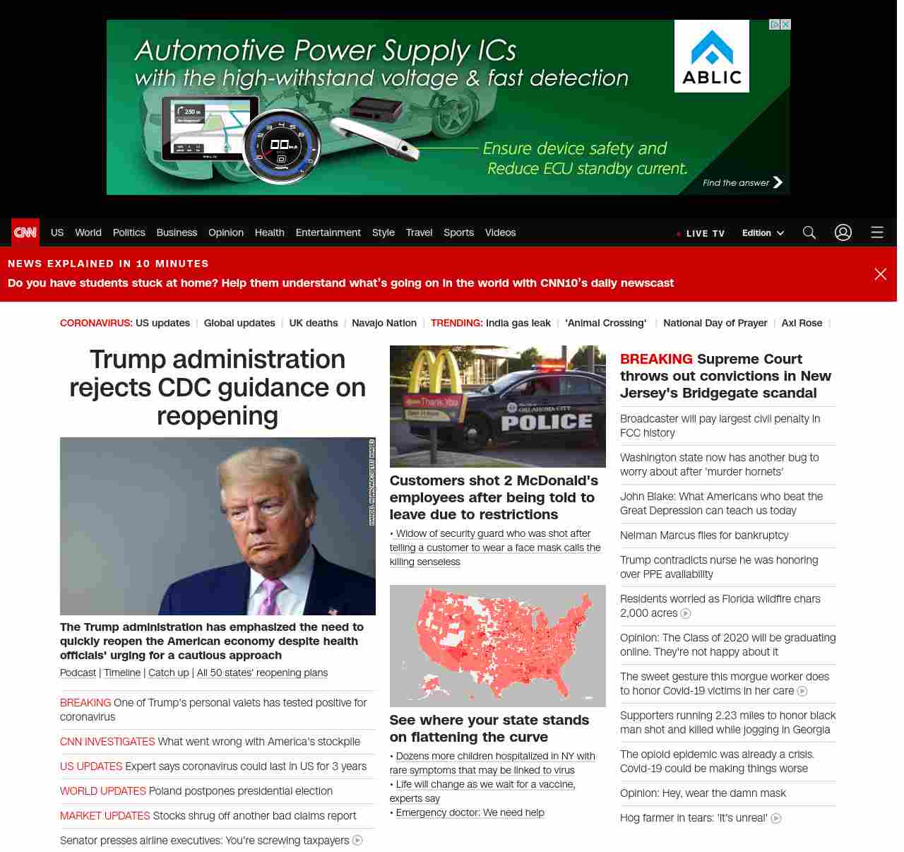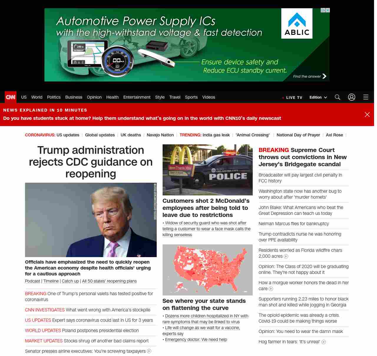 || screaming-banner-text banner-text-size–char-47″ data-analytics=”_list-hierarchical-xs_article_”> Trump administration rejects CDC guidance on reopening ||” , title: “CNN – Breaking News, Latest News and Videos” , siblings: {“articleList”:[{“uri”:”/2020/05/07/politics/cdc-guidance-coronavirus-reopen-america/index.html”,”headline”:”u003cstrong>Officials have emphasized the need to quickly reopen the American economy despite health officials’ urging for a cautious approachu003c/strong>”,”thumbnail”:”//cdn.cnn.com/cnnnext/dam/assets/200403082550-donald-trump-0401-small-11.jpg”,”duration”:””,”description”:”u003ca href=”https://www.cnn.com/audio/podcasts/corona-virus” target=”_blank”>Podcastu003c/a> | u003ca href=”https://www.cnn.com/interactive/2020/health/covid19-pandemic-video-timeline/index.html” target=”_blank”>Timelineu003c/a> | u003ca href=”https://www.cnn.com/2020/05/07/world/coronavirus-newsletter-05-07-20-intl/index.html” target=”_blank”>Catch upu003c/a> | u003ca href=”https://www.cnn.com/interactive/2020/us/states-reopen-coronavirus-trnd/” target=”_blank”>All 50 states’ reopening plansu003c/a>”,”layout”:””