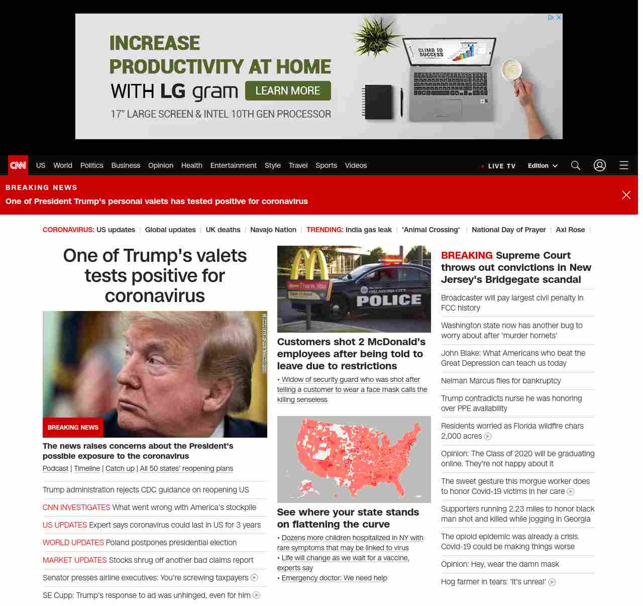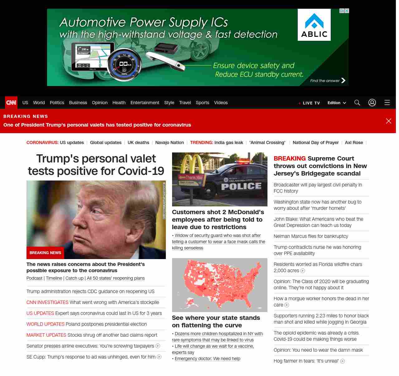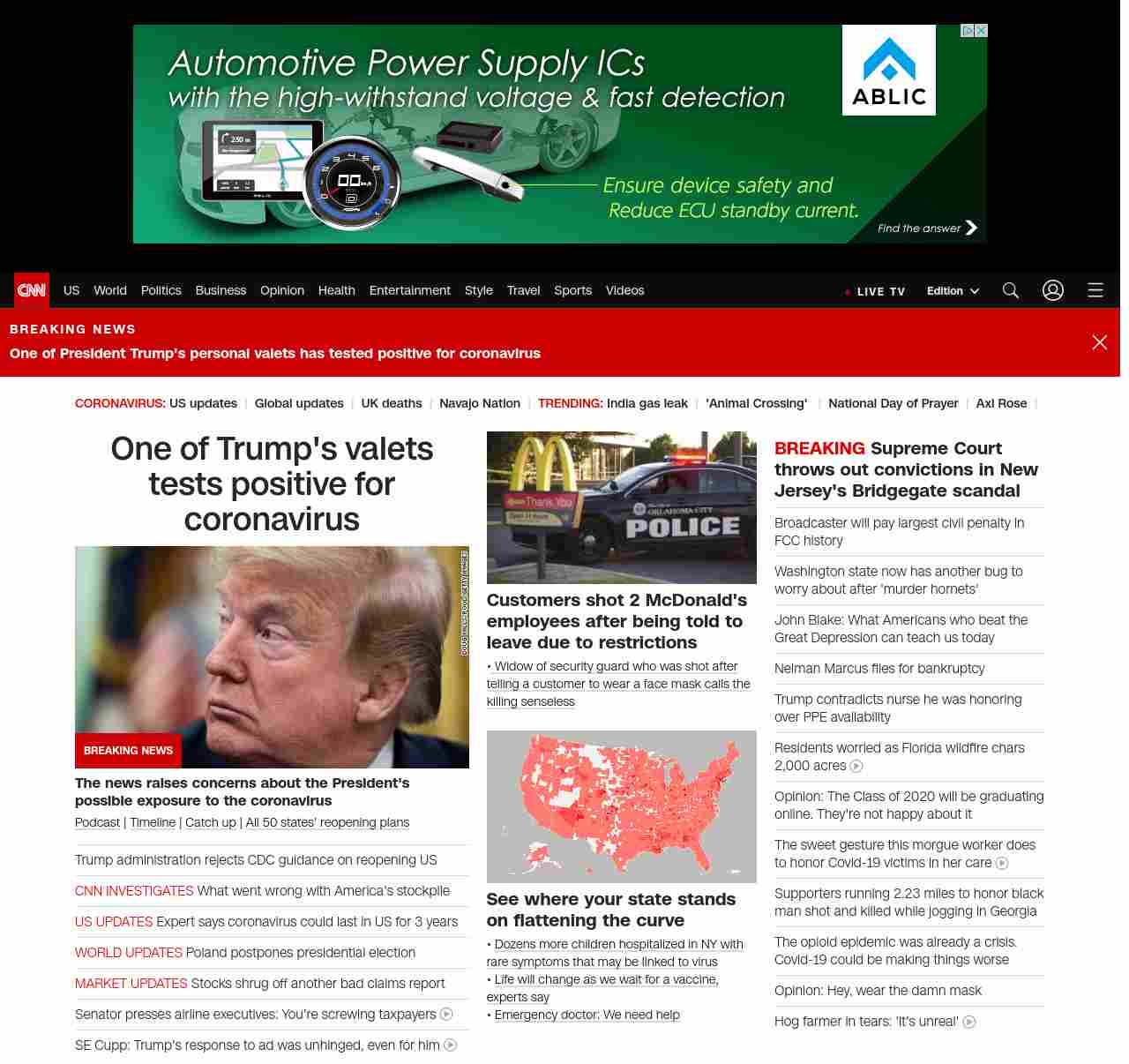 || screaming-banner-text banner-text-size–char-47″ data-analytics=”_list-hierarchical-xs_article_”> One of Trump’s valets tests positive for coronavirus ||” , title: “CNN – Breaking News, Latest News and Videos” , siblings: {“articleList”:[{“uri”:”/2020/05/07/politics/trump-valet-tests-positive-covid-19/index.html”,”headline”:”u003cstrong>The news raises concerns about the President’s possible exposure to the coronavirusu003c/strong>”,”thumbnail”:”//cdn.cnn.com/cnnnext/dam/assets/200506145239-02-trump-0506-small-11.jpg”,”duration”:””,”description”:”u003ca href=”https://www.cnn.com/audio/podcasts/corona-virus” target=”_blank”>Podcastu003c/a> | u003ca href=”https://www.cnn.com/interactive/2020/health/covid19-pandemic-video-timeline/index.html” target=”_blank”>Timelineu003c/a> | u003ca href=”https://www.cnn.com/2020/05/07/world/coronavirus-newsletter-05-07-20-intl/index.html” target=”_blank”>Catch upu003c/a> | u003ca href=”https://www.cnn.com/interactive/2020/us/states-reopen-coronavirus-trnd/” target=”_blank”>All 50 states’ reopening plansu003c/a>”,”layout”:””