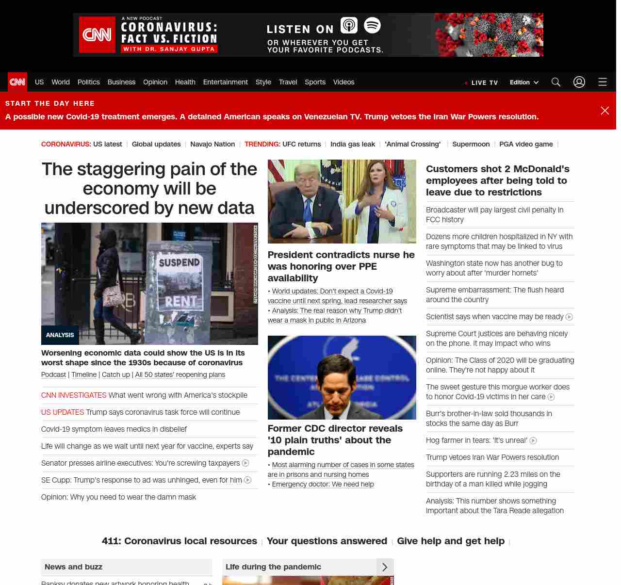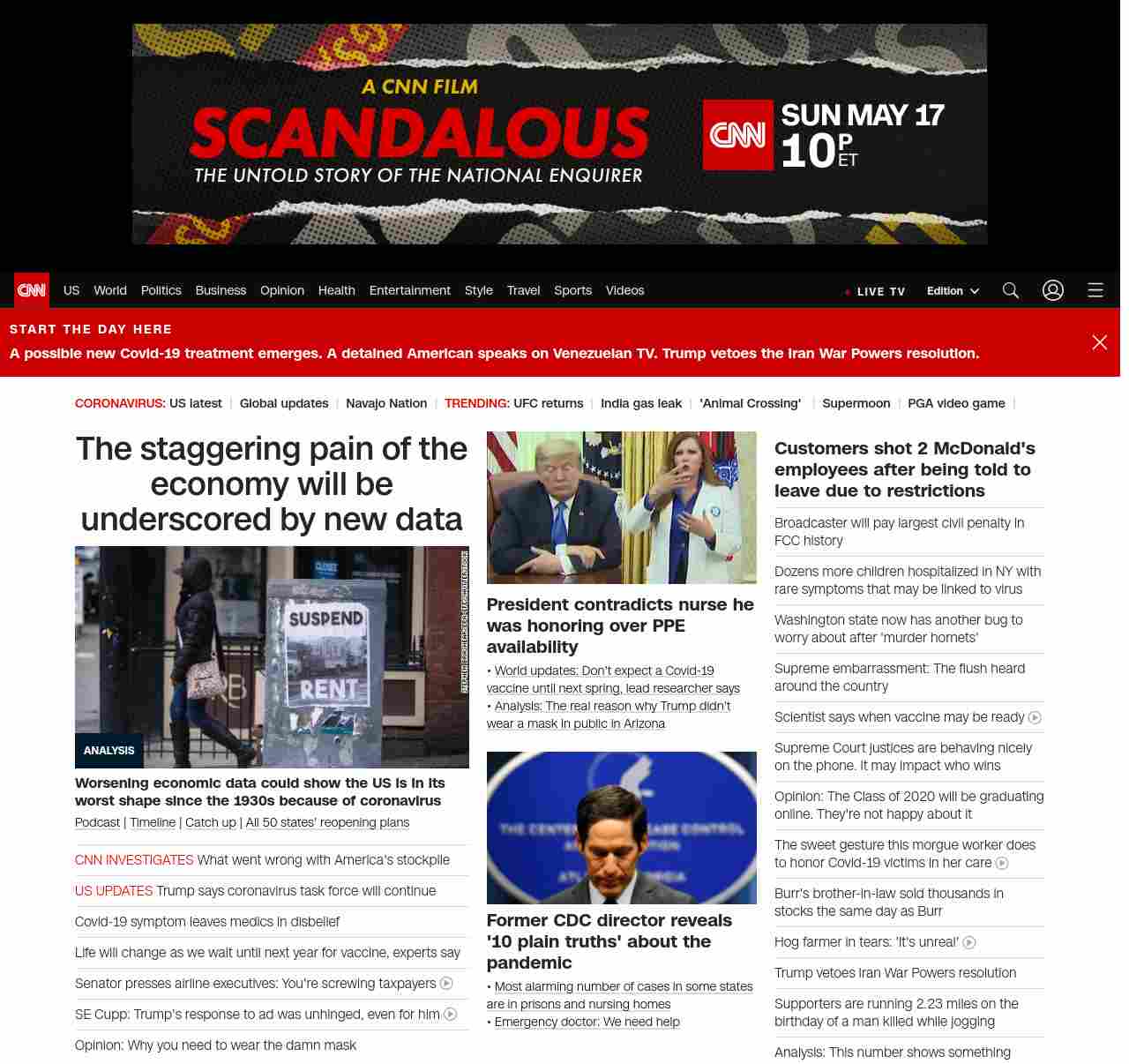 || screaming-banner-text banner-text-size–char-47″ data-analytics=”_list-hierarchical-xs_article_”> The staggering pain of the economy will be underscored by new data ||” , title: “CNN – Breaking News, Latest News and Videos” , siblings: {“articleList”:[{“uri”:”/2020/05/07/health/us-coronavirus-thursday/index.html”,”headline”:”Experts warn a vaccine won’t likely be ready this year. In the meantime, contact tracing, isolation and quarantine will need to ramp up.”,”thumbnail”:”//cdn.cnn.com/cnnnext/dam/assets/200507041502-coronavirus-main-thursday-us-small-11.jpg”,”duration”:””,”description”:”u003ca href=”https://www.cnn.com/audio/podcasts/corona-virus” target=”_blank”>Podcastu003c/a> | u003ca href=”https://www.cnn.com/interactive/2020/health/covid19-pandemic-video-timeline/index.html” target=”_blank”>Timelineu003c/a> | u003ca href=”https://www.cnn.com/interactive/2020/us/states-reopen-coronavirus-trnd/” target=”_blank”>All 50 states’ reopening plansu003c/a>”,”layout”:””