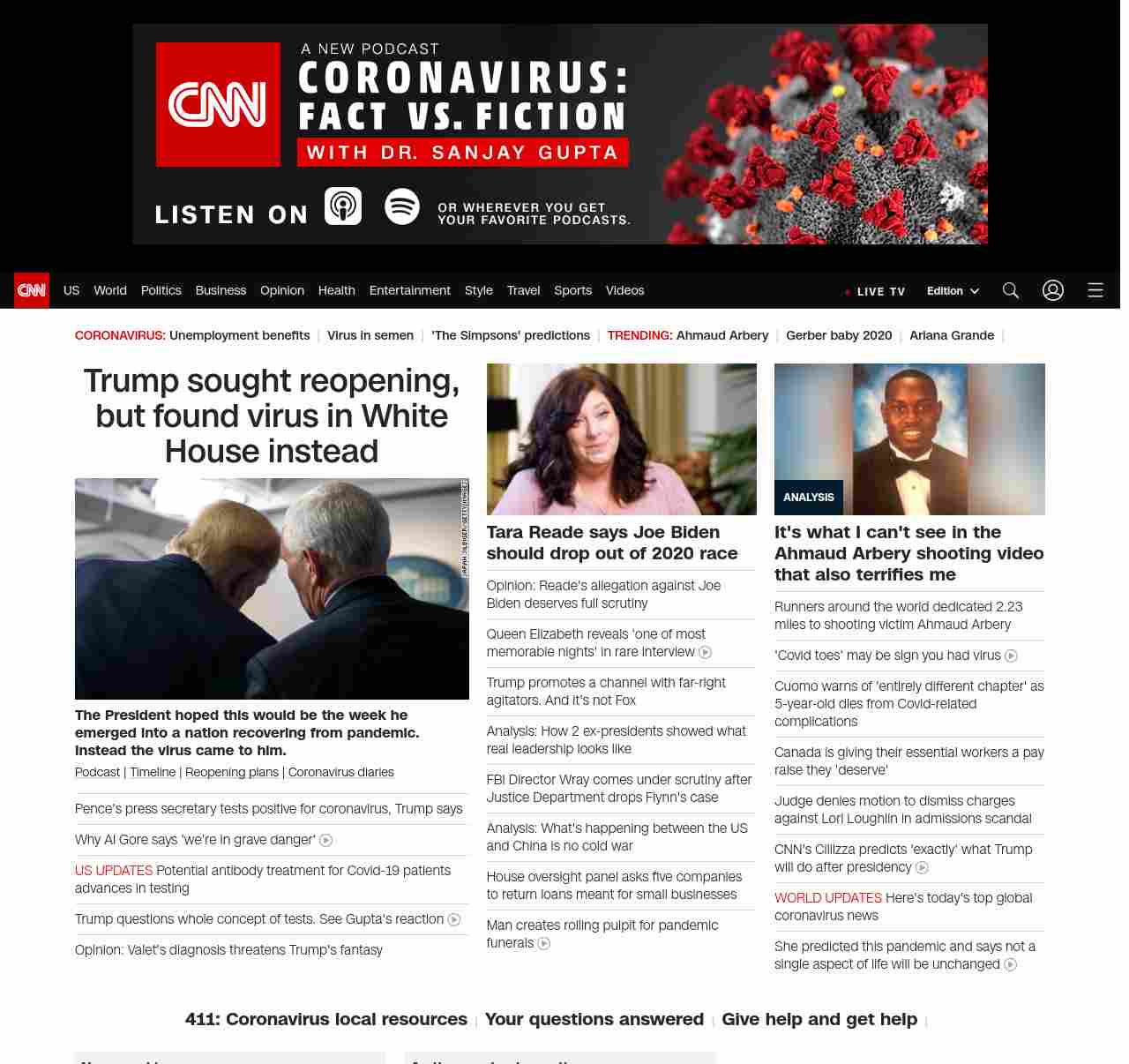 || screaming-banner-text banner-text-size–char-47″ data-analytics=”_list-hierarchical-xs_article_”> Trump sought reopening, but found virus in White House instead ||” , title: “CNN – Breaking News, Latest News and Videos” , siblings: {“articleList”:[{“uri”:”/2020/05/08/politics/donald-trump-staffers-coronavirus/index.html”,”headline”:”u003cstrong>The President hoped this would be the week he emerged into a nation recovering from pandemic. Instead the virus came to him.u003c/strong>”,”thumbnail”:”//cdn.cnn.com/cnnnext/dam/assets/200504131541-01-trump-pence-small-11.jpg”,”duration”:””,”description”:”u003ca href=”https://www.cnn.com/audio/podcasts/corona-virus” target=”_blank”>Podcastu003c/a> | u003ca href=”https://www.cnn.com/interactive/2020/health/covid19-pandemic-video-timeline/index.html” target=”_blank”>Timelineu003c/a> | u003ca href=”https://www.cnn.com/interactive/2020/us/states-reopen-coronavirus-trnd/” target=”_blank”>Reopening plansu003c/a> | u003ca href=”https://www.cnn.com/specials/world/coronavirus-diaries” target=”_blank”>Coronavirus diariesu003c/a>”,”layout”:””