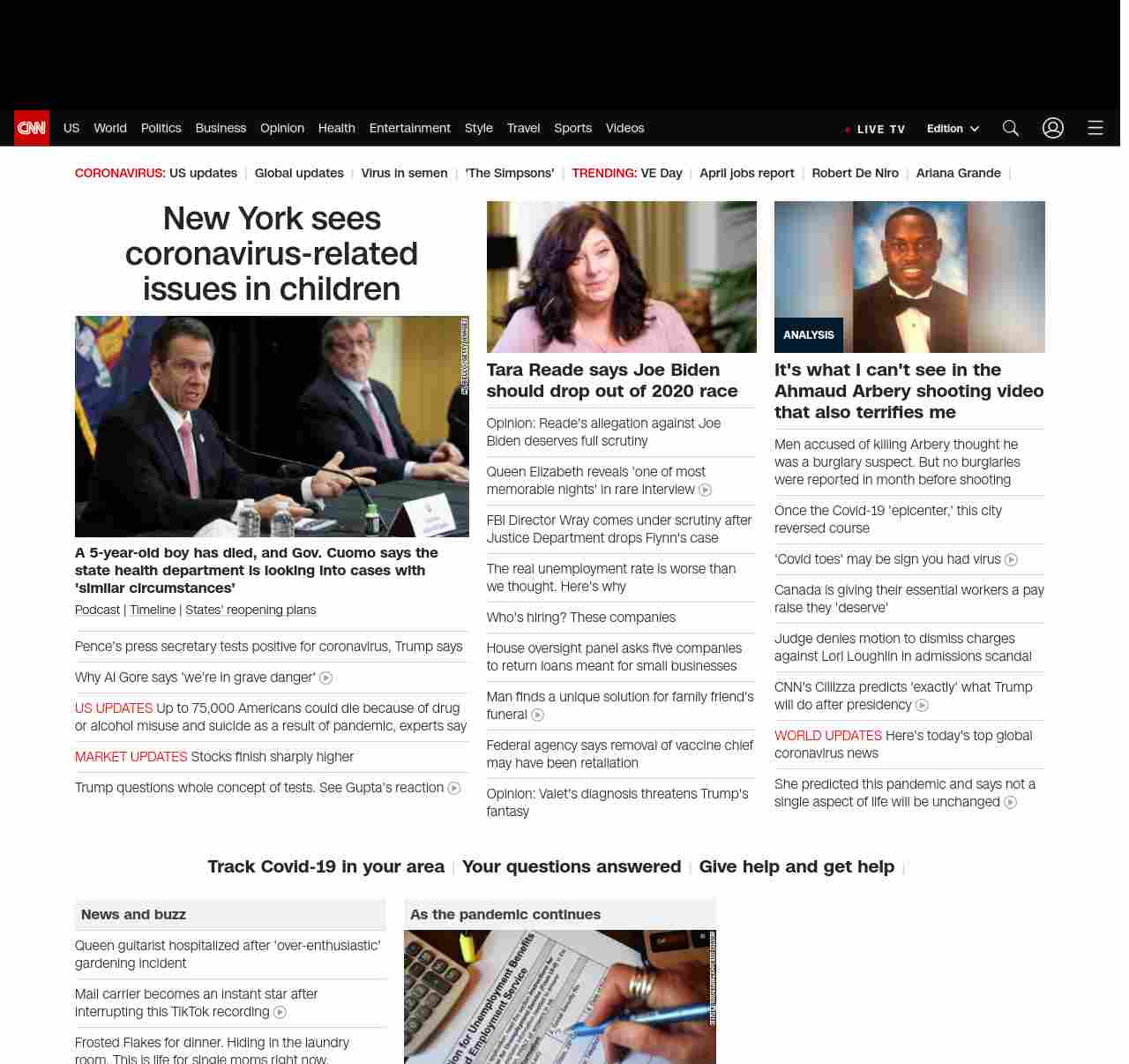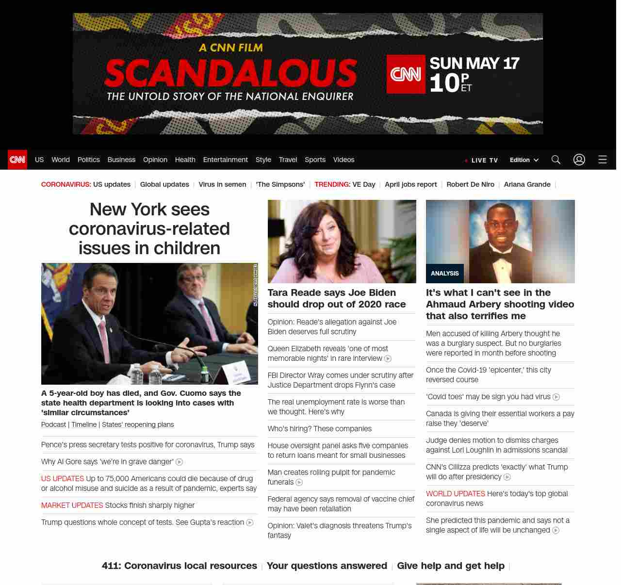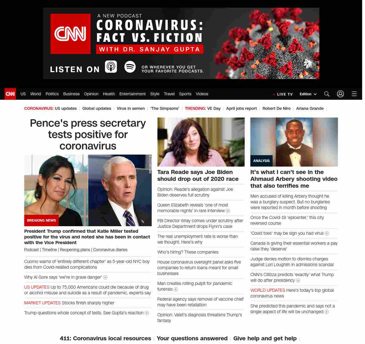 || screaming-banner-text banner-text-size–char-47″ data-analytics=”_list-hierarchical-xs_hyperlink_”> Pence’s press secretary tests positive for coronavirus ||” , title: “CNN – Breaking News, Latest News and Videos” , siblings: {“articleList”:[{“uri”:”/2020/05/08/us/cuomo-child-nyc-dies-coronavirus-trnd/index.html”,”headline”:”u003cstrong>A 5-year-old boy has died, and Gov. Cuomo says the state health department is looking into cases with ‘similar circumstances’u003c/strong>”,”thumbnail”:”//cdn.cnn.com/cnnnext/dam/assets/200508130315-cuomo-press-conf-trnd-small-11.jpg”,”duration”:””,”description”:”u003ca href=”https://www.cnn.com/audio/podcasts/corona-virus” target=”_blank”>Podcastu003c/a> | u003ca href=”https://www.cnn.com/interactive/2020/health/covid19-pandemic-video-timeline/index.html” target=”_blank”>Timelineu003c/a> | u003ca href=”https://www.cnn.com/interactive/2020/us/states-reopen-coronavirus-trnd/” target=”_blank”>States’ reopening plansu003c/a>”,”layout”:””