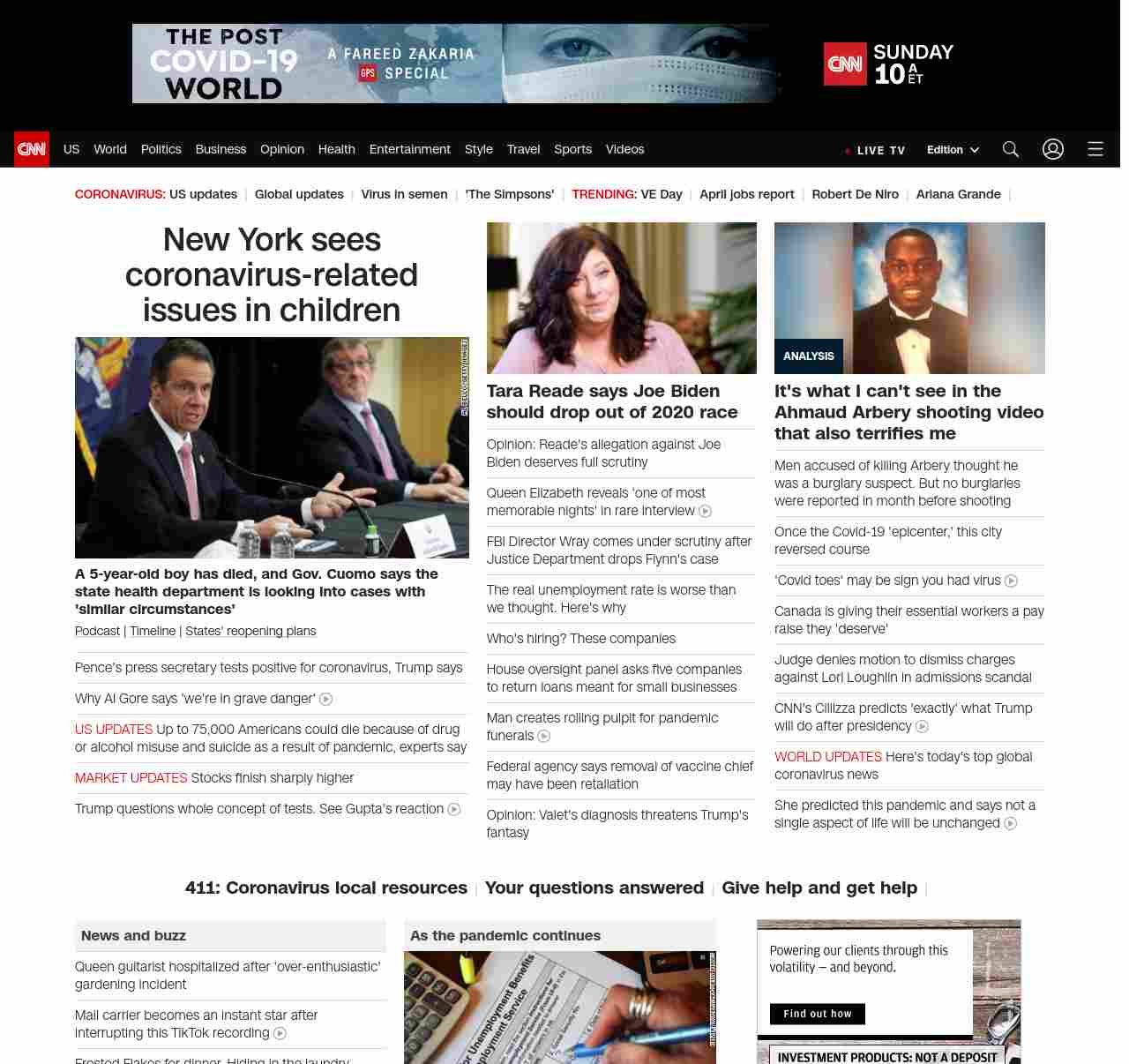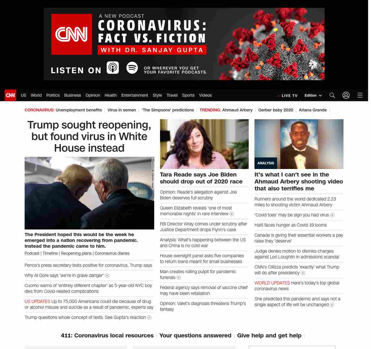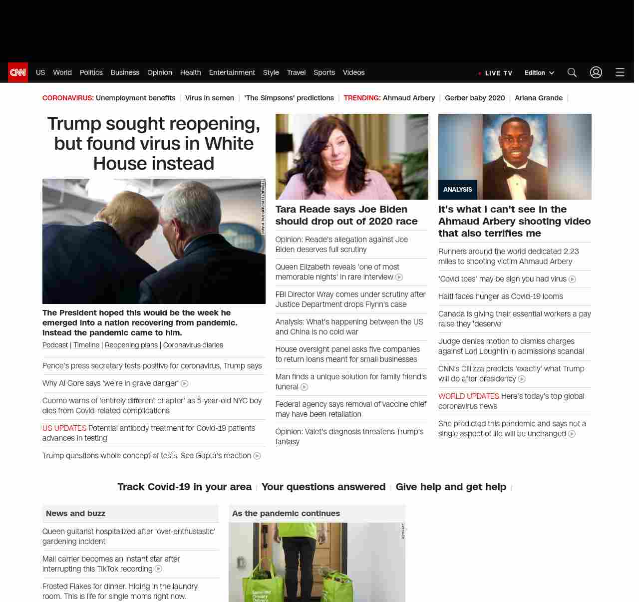 || screaming-banner-text banner-text-size–char-47″ data-analytics=”_list-hierarchical-xs_hyperlink_”> Pence’s press secretary tests positive for coronavirus ||” , title: “CNN – Breaking News, Latest News and Videos” , siblings: {“articleList”:[{“uri”:”/2020/05/08/us/cuomo-child-nyc-dies-coronavirus-trnd/index.html”,”headline”:”u003cstrong>A 5-year-old boy has died, and Gov. Cuomo says the state health department is looking into cases with ‘similar circumstances’u003c/strong>”,”thumbnail”:”//cdn.cnn.com/cnnnext/dam/assets/200508130315-cuomo-press-conf-trnd-small-11.jpg”,”duration”:””,”description”:”u003ca href=”https://www.cnn.com/audio/podcasts/corona-virus” target=”_blank”>Podcastu003c/a> | u003ca href=”https://www.cnn.com/interactive/2020/health/covid19-pandemic-video-timeline/index.html” target=”_blank”>Timelineu003c/a> | u003ca href=”https://www.cnn.com/interactive/2020/us/states-reopen-coronavirus-trnd/” target=”_blank”>States’ reopening plansu003c/a>”,”layout”:””