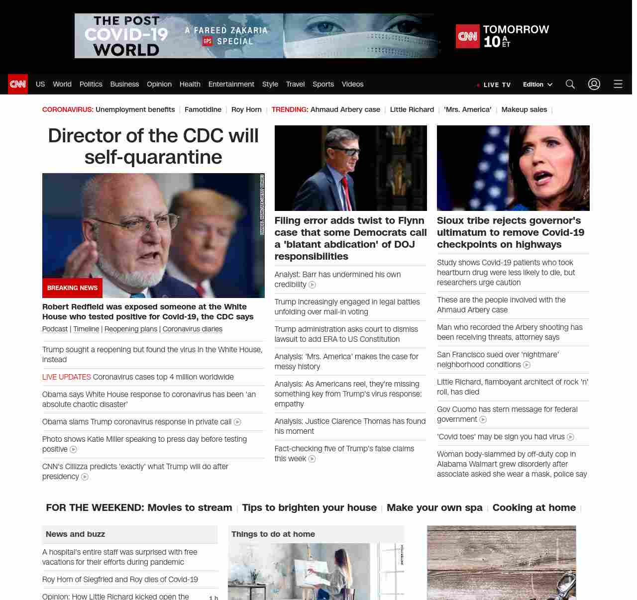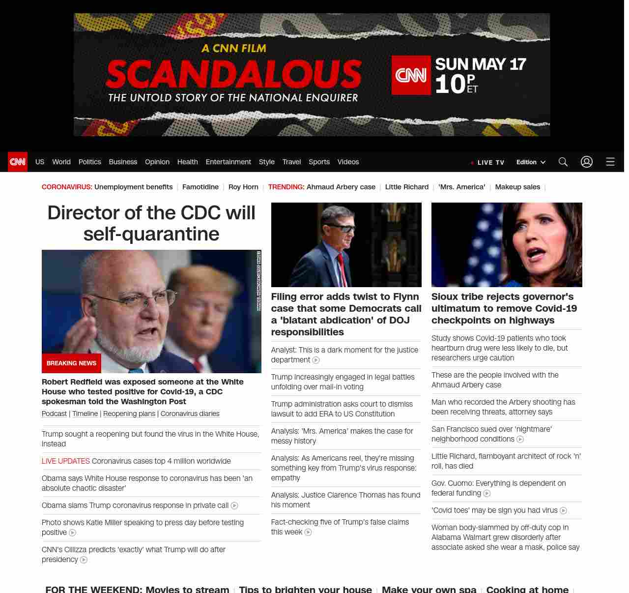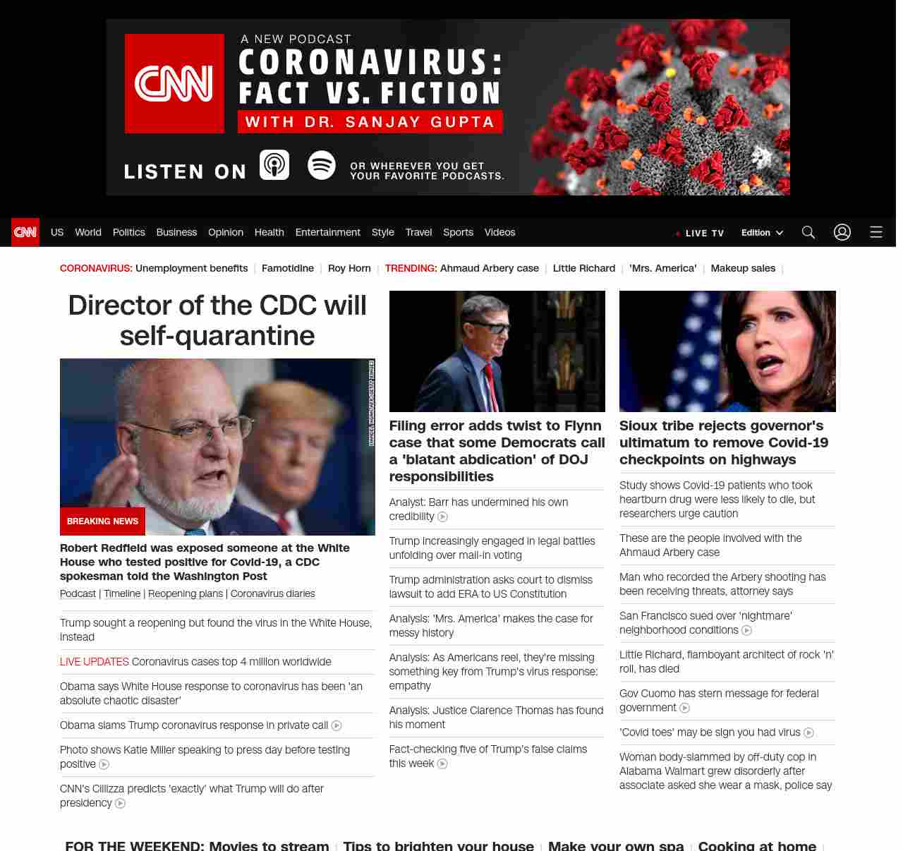 || screaming-banner-text banner-text-size–char-41″ data-analytics=”_list-hierarchical-xs_article_”> Director of the CDC will self-quarantine ||” , title: “CNN – Breaking News, Latest News and Videos” , siblings: {“articleList”:[{“uri”:”/2020/05/09/politics/robert-redfield-cdc-director-self-quarantine/index.html”,”headline”:”u003cstrong>Robert Redfield was exposed someone at the White House who tested positive for Covid-19, the CDC saysu003c/strong>”,”thumbnail”:”//cdn.cnn.com/cnnnext/dam/assets/200422171814-robert-redfield-cdc-small-11.jpg”,”duration”:””,”description”:”u003ca href=”https://www.cnn.com/audio/podcasts/corona-virus” target=”_blank”>Podcastu003c/a> | u003ca href=”https://www.cnn.com/interactive/2020/health/covid19-pandemic-video-timeline/index.html” target=”_blank”>Timelineu003c/a> | u003ca href=”https://www.cnn.com/interactive/2020/us/states-reopen-coronavirus-trnd/” target=”_blank”>Reopening plansu003c/a> | u003ca href=”https://www.cnn.com/specials/world/coronavirus-diaries” target=”_blank”>Coronavirus diariesu003c/a>”,”layout”:””