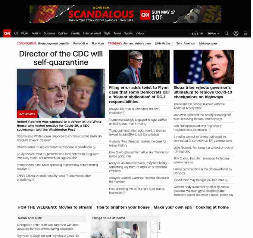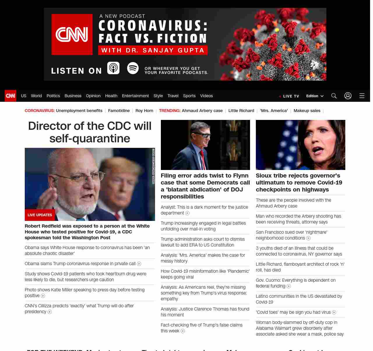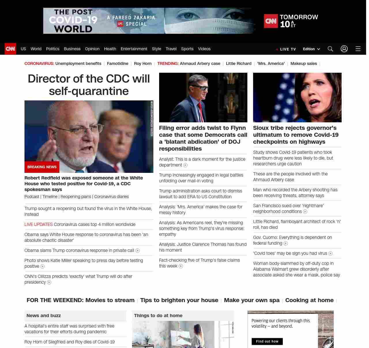 || screaming-banner-text banner-text-size–char-41″ data-analytics=”_list-hierarchical-xs_article_”> Director of the CDC will self-quarantine ||” , title: “CNN – Breaking News, Latest News and Videos” , siblings: {“articleList”:[{“uri”:”/2020/05/09/politics/robert-redfield-cdc-director-self-quarantine/index.html”,”headline”:”u003cstrong>Robert Redfield was exposed someone at the White House who tested positive for Covid-19, the CDC saysu003c/strong>”,”thumbnail”:”//cdn.cnn.com/cnnnext/dam/assets/200422171814-robert-redfield-cdc-small-11.jpg”,”duration”:””,”description”:”u003ca href=”https://www.cnn.com/audio/podcasts/corona-virus” target=”_blank”>Podcastu003c/a> | u003ca href=”https://www.cnn.com/interactive/2020/health/covid19-pandemic-video-timeline/index.html” target=”_blank”>Timelineu003c/a> | u003ca href=”https://www.cnn.com/interactive/2020/us/states-reopen-coronavirus-trnd/” target=”_blank”>Reopening plansu003c/a> | u003ca href=”https://www.cnn.com/specials/world/coronavirus-diaries” target=”_blank”>Coronavirus diariesu003c/a>”,”layout”:””