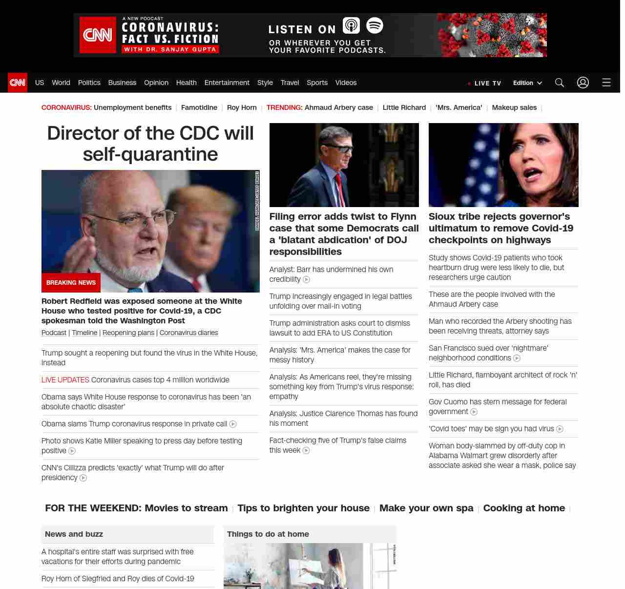 || screaming-banner-text banner-text-size–char-41″ data-analytics=”_list-hierarchical-xs_article_”> Director of the CDC will self-quarantine ||” , title: “CNN – Breaking News, Latest News and Videos” , siblings: {“articleList”:[{“uri”:”/2020/05/09/politics/robert-redfield-cdc-director-self-quarantine/index.html”,”headline”:”u003cstrong>Robert Redfield was exposed someone at the White House who tested positive for Covid-19, a CDC spokesman saysu003c/strong>”,”thumbnail”:”//cdn.cnn.com/cnnnext/dam/assets/200422171814-robert-redfield-cdc-small-11.jpg”,”duration”:””,”description”:”u003ca href=”https://www.cnn.com/audio/podcasts/corona-virus” target=”_blank”>Podcastu003c/a> | u003ca href=”https://www.cnn.com/interactive/2020/health/covid19-pandemic-video-timeline/index.html” target=”_blank”>Timelineu003c/a> | u003ca href=”https://www.cnn.com/interactive/2020/us/states-reopen-coronavirus-trnd/” target=”_blank”>Reopening plansu003c/a> | u003ca href=”https://www.cnn.com/specials/world/coronavirus-diaries” target=”_blank”>Coronavirus diariesu003c/a>”,”layout”:””