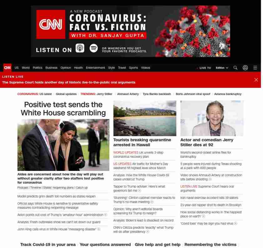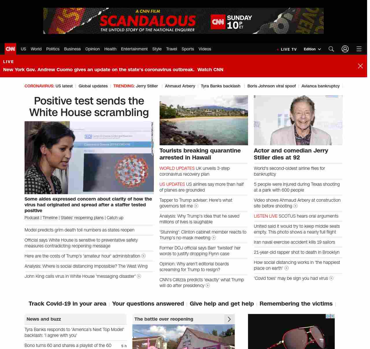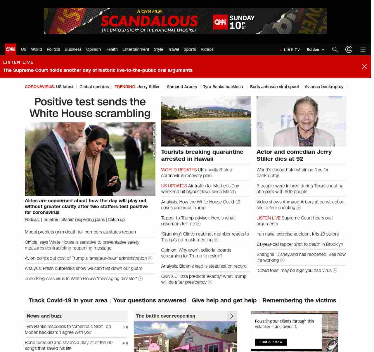 || screaming-banner-text banner-text-size–char-47″ data-analytics=”_list-hierarchical-xs_article_”> Positive test sends the White House scrambling ||” , title: “CNN – Breaking News, Latest News and Videos” , siblings: {“articleList”:[{“uri”:”/2020/05/11/politics/katie-miller-contract-tracing-coronavirus/index.html”,”headline”:”u003cstrong>Aides are concerned about how the day will play out without greater clarity after two staffers test positive for coronavirusu003c/strong>”,”thumbnail”:”//cdn.cnn.com/cnnnext/dam/assets/200511085306-02-katie-miller-file-small-11.jpg”,”duration”:””,”description”:”u003ca href=”https://www.cnn.com/audio/podcasts/corona-virus” target=”_blank”>Podcastu003c/a> | u003ca href=”https://www.cnn.com/interactive/2020/health/covid19-pandemic-video-timeline/index.html” target=”_blank”>Timelineu003c/a> | u003ca href=”https://www.cnn.com/interactive/2020/us/states-reopen-coronavirus-trnd/” target=”_blank”>States’ reopening plansu003c/a> | u003ca href=”https://www.cnn.com/2020/05/11/world/coronavirus-newsletter-05-11-20-intl/index.html” target=”_blank”>Catch upu003c/a>”,”layout”:””