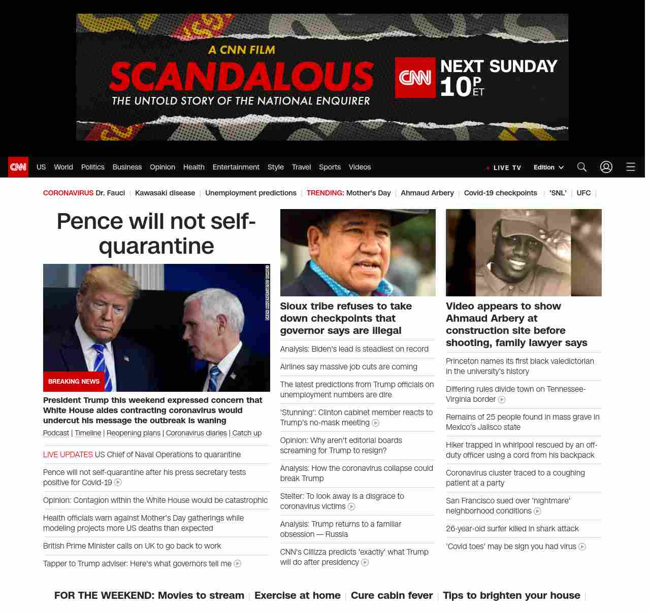 || screaming-banner-text banner-text-size–char-32″ data-analytics=”_list-hierarchical-xs_article_”> Pence will not self-quarantine ||” , title: “CNN – Breaking News, Latest News and Videos” , siblings: {“articleList”:[{“uri”:”/2020/05/10/politics/mike-pence-self-isolate-coronavirus/index.html”,”headline”:”u003cstrong>President Trump this weekend expressed concern that White House aides contracting coronavirus would undercut his message the outbreak is waningu003c/strong>”,”thumbnail”:”//cdn.cnn.com/cnnnext/dam/assets/200510202245-pence-trump-coronavirus-briefing-0423-small-11.jpg”,”duration”:””,”description”:”u003ca href=”https://www.cnn.com/audio/podcasts/corona-virus” target=”_blank”>Podcastu003c/a> | u003ca href=”https://www.cnn.com/interactive/2020/health/covid19-pandemic-video-timeline/index.html” target=”_blank”>Timelineu003c/a> | u003ca href=”https://www.cnn.com/interactive/2020/us/states-reopen-coronavirus-trnd/” target=”_blank”>Reopening plansu003c/a> | u003ca href=”https://www.cnn.com/specials/world/coronavirus-diaries” target=”_blank”>Coronavirus diariesu003c/a> | u003ca href=”https://www.cnn.com/2020/05/10/world/coronavirus-newsletter-05-10-20-intl/index.html” target=”_blank”>Catch upu003c/a> “,”layout”:””