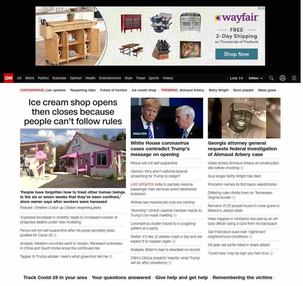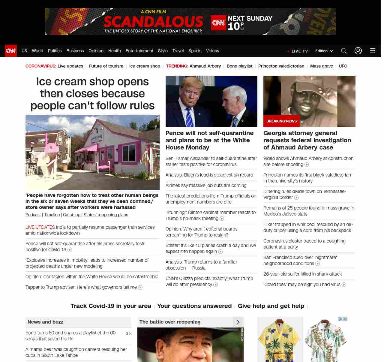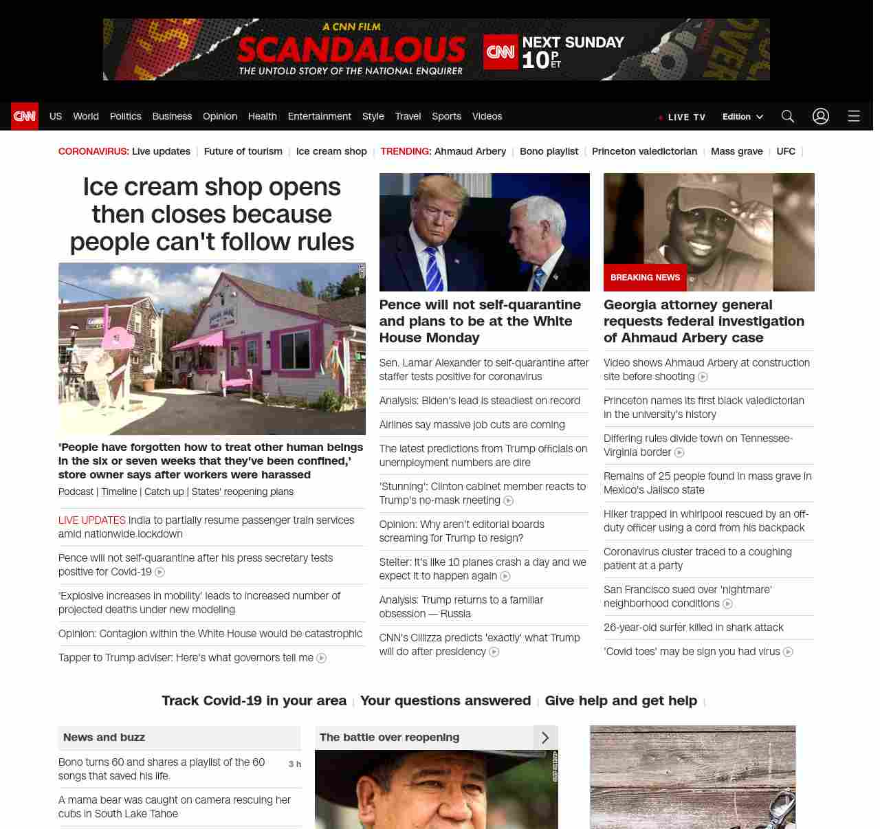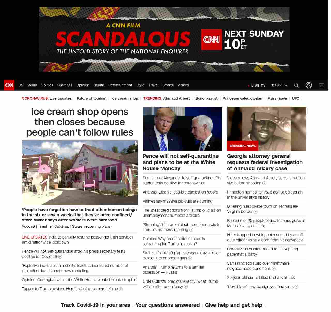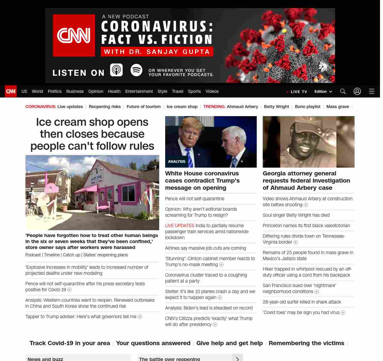 || screaming-banner-text banner-text-size–char-47″ data-analytics=”_list-hierarchical-xs_article_”> Ice cream shop opens then closes because people can’t follow rules ||” , title: “CNN – Breaking News, Latest News and Videos” , siblings: {“articleList”:[{“uri”:”/2020/05/10/us/ice-cream-shop-closes-employee-harassment-trnd/index.html”,”headline”:”u003cstrong>’People have forgotten how to treat other human beings in the six or seven weeks that they’ve been confined,’ store owner says after workers were harassedu003c/strong>”,”thumbnail”:”//cdn.cnn.com/cnnnext/dam/assets/200510182214-ice-cream-shop-closes-one-day-after-opening-small-11.jpg”,”duration”:””,”description”:”u003ca href=”https://www.cnn.com/audio/podcasts/corona-virus” target=”_blank”>Podcastu003c/a> | u003ca href=”https://www.cnn.com/interactive/2020/health/covid19-pandemic-video-timeline/index.html” target=”_blank”>Timelineu003c/a> | u003ca href=”https://www.cnn.com/2020/05/10/world/coronavirus-newsletter-05-10-20-intl/index.html” target=”_blank”>Catch up u003c/a>| u003ca href=”https://www.cnn.com/interactive/2020/us/states-reopen-coronavirus-trnd/” target=”_blank”>States’ reopening plansu003c/a>”,”layout”:””