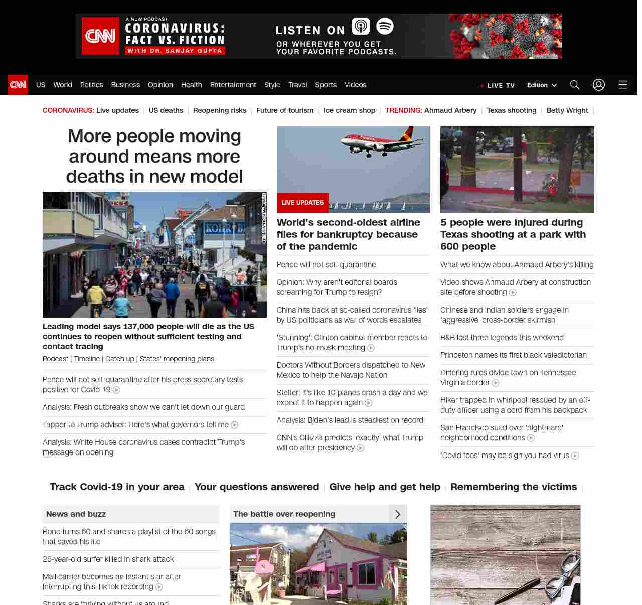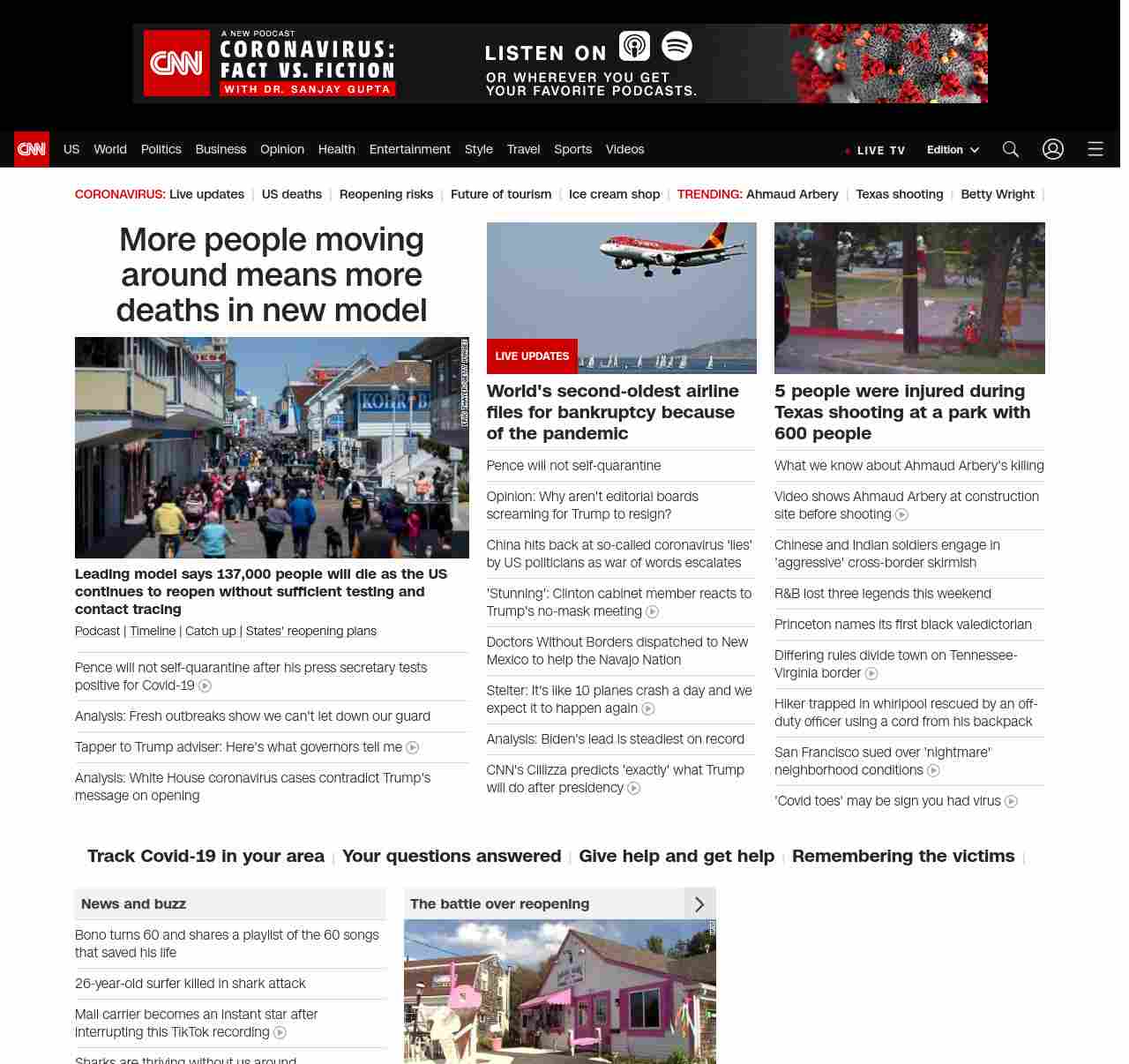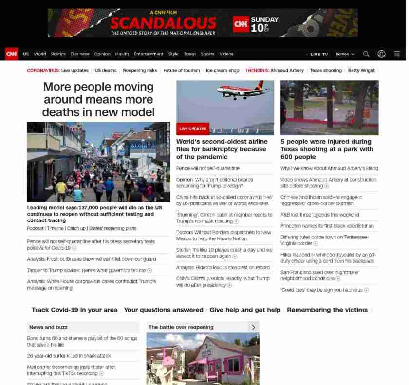 || screaming-banner-text banner-text-size–char-47″ data-analytics=”_list-hierarchical-xs_article_”> More people moving around means more deaths in new model ||” , title: “CNN – Breaking News, Latest News and Videos” , siblings: {“articleList”:[{“uri”:”/2020/05/11/health/us-coronavirus-monday/index.html”,”headline”:”u003cstrong>Leading model says 137,000 people will die as the US continues to reopen without sufficient testing and contact tracingu003c/strong>”,”thumbnail”:”//cdn.cnn.com/cnnnext/dam/assets/200511041451-02-coronavirus-reopening-0510-maryland-small-11.jpg”,”duration”:””,”description”:”u003ca href=”https://www.cnn.com/audio/podcasts/corona-virus” target=”_blank”>Podcastu003c/a> | u003ca href=”https://www.cnn.com/interactive/2020/health/covid19-pandemic-video-timeline/index.html” target=”_blank”>Timelineu003c/a> | u003ca href=”https://www.cnn.com/2020/05/10/world/coronavirus-newsletter-05-10-20-intl/index.html” target=”_blank”>Catch up u003c/a>| u003ca href=”https://www.cnn.com/interactive/2020/us/states-reopen-coronavirus-trnd/” target=”_blank”>States’ reopening plansu003c/a>”,”layout”:””