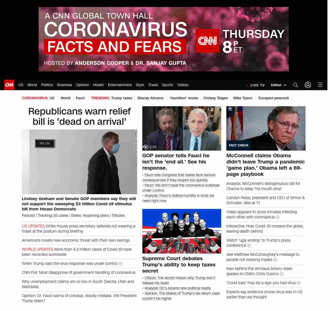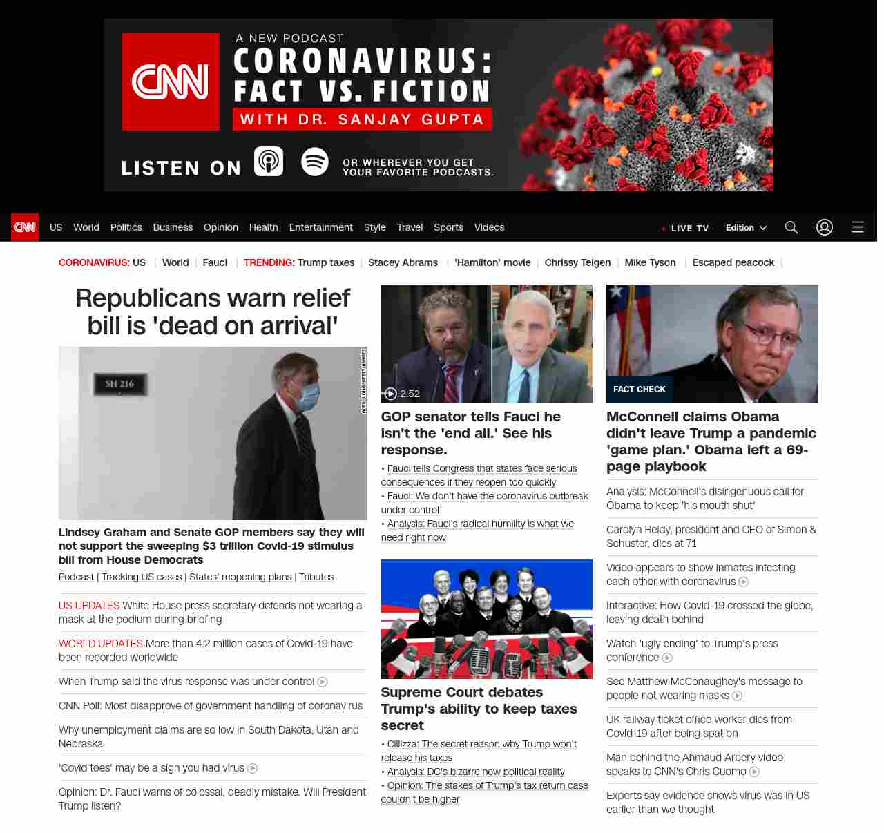 || screaming-banner-text banner-text-size–char-47″ data-analytics=”_list-hierarchical-xs_article_”> Republicans warn relief bill is ‘dead on arrival’ ||” , title: “CNN – Breaking News, Latest News and Videos” , siblings: {“articleList”:[{“uri”:”/2020/05/12/politics/3-trillion-aid-package-democrats-house/index.html”,”headline”:”u003cstrong>Lindsey Graham and Senate GOP members say they will not support the sweeping $3 trillion Covid-19 stimulus bill from House Democratsu003c/strong>”,”thumbnail”:”//cdn.cnn.com/cnnnext/dam/assets/200512150929-lindsey-graham-0512-small-11.jpg”,”duration”:””,”description”:”u003ca href=”https://www.cnn.com/audio/podcasts/corona-virus” target=”_blank”>Podcastu003c/a> | u003ca href=”https://www.cnn.com/interactive/2020/health/coronavirus-us-maps-and-cases/” target=”_blank”>Tracking US casesu003c/a> | u003ca href=”https://www.cnn.com/interactive/2020/us/states-reopen-coronavirus-trnd/” target=”_blank”>States’ reopening plansu003c/a> | u003ca href=”https://www.cnn.com/interactive/2020/health/coronavirus-victims-memories/” target=”_blank”>Tributesu003c/a>”,”layout”:””
