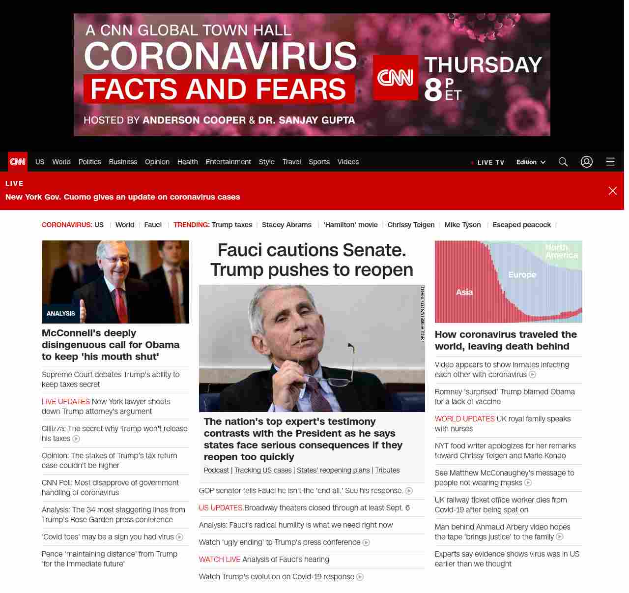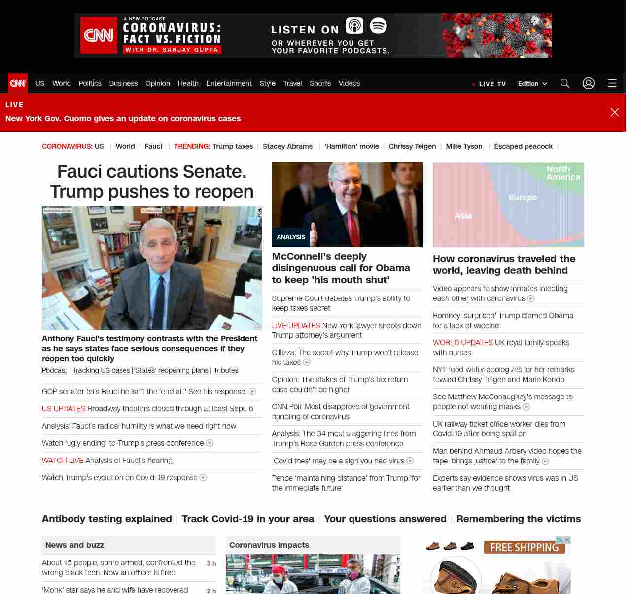 || screaming-banner-text banner-text-size–char-47″ data-analytics=”_list-hierarchical-xs_article_”> Fauci cautions Senate. Trump pushes to reopen ||” , title: “CNN – Breaking News, Latest News and Videos” , siblings: {“articleList”:[{“uri”:”/2020/05/12/politics/anthony-fauci-congress-hearing/index.html”,”headline”:”u003cstrong>Anthony Fauci’s testimony contrasts with the President as he says states face serious consequences if they reopen too quicklyu003c/strong>”,”thumbnail”:”//cdn.cnn.com/cnnnext/dam/assets/200512104539-07-senate-help-hearing-fauci-screengrab-small-11.jpg”,”duration”:””,”description”:”u003ca href=”https://www.cnn.com/audio/podcasts/corona-virus” target=”_blank”>Podcastu003c/a> | u003ca href=”https://www.cnn.com/interactive/2020/health/coronavirus-us-maps-and-cases/” target=”_blank”>Tracking US casesu003c/a> | u003ca href=”https://www.cnn.com/interactive/2020/us/states-reopen-coronavirus-trnd/” target=”_blank”>States’ reopening plansu003c/a> | u003ca href=”https://www.cnn.com/interactive/2020/health/coronavirus-victims-memories/” target=”_blank”>Tributesu003c/a>”,”layout”:””