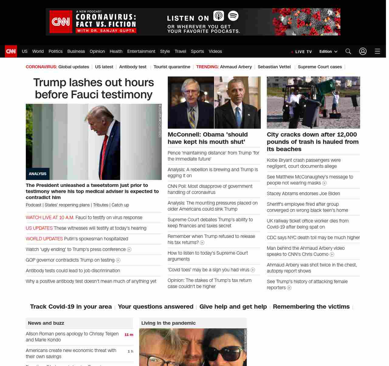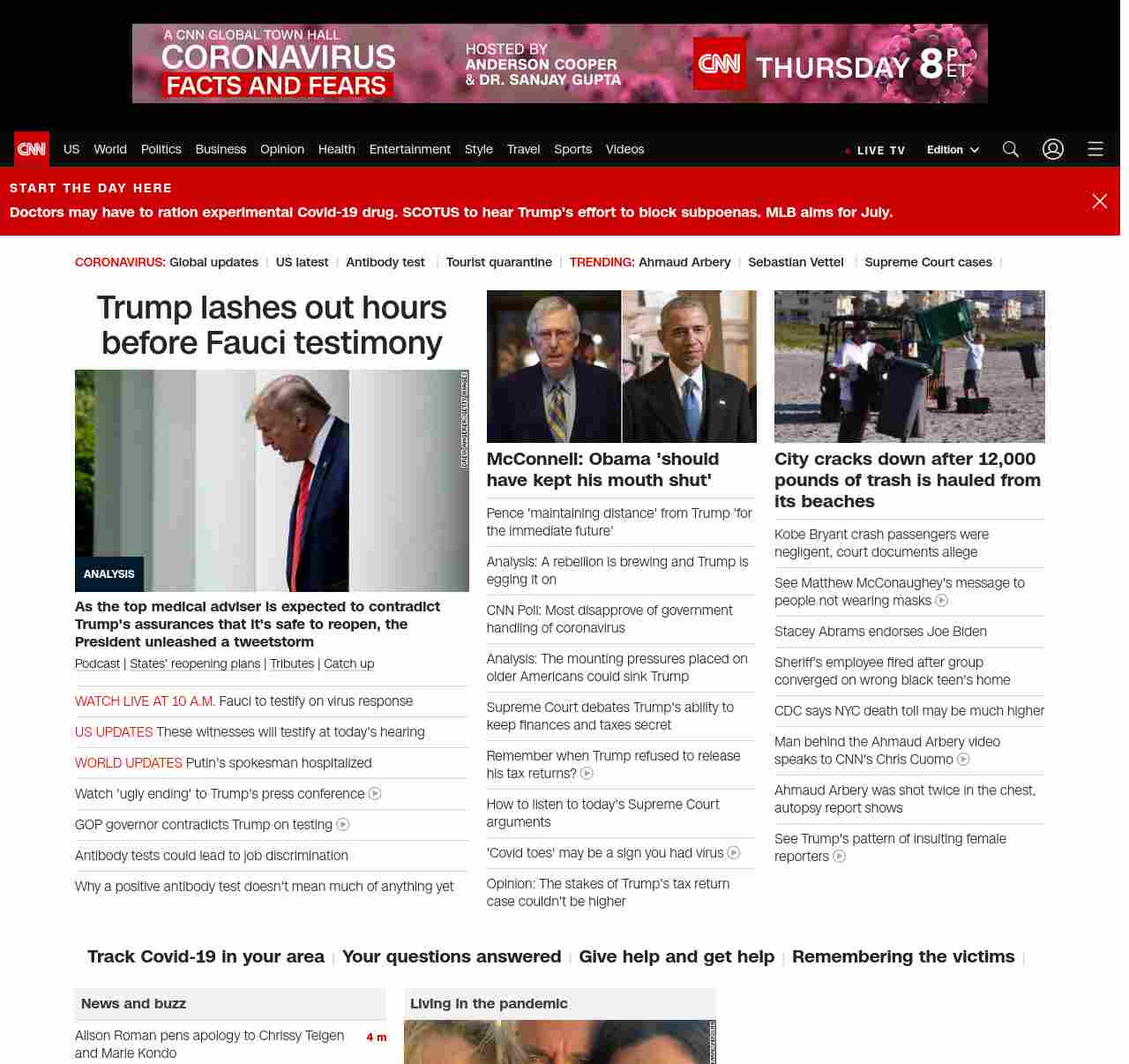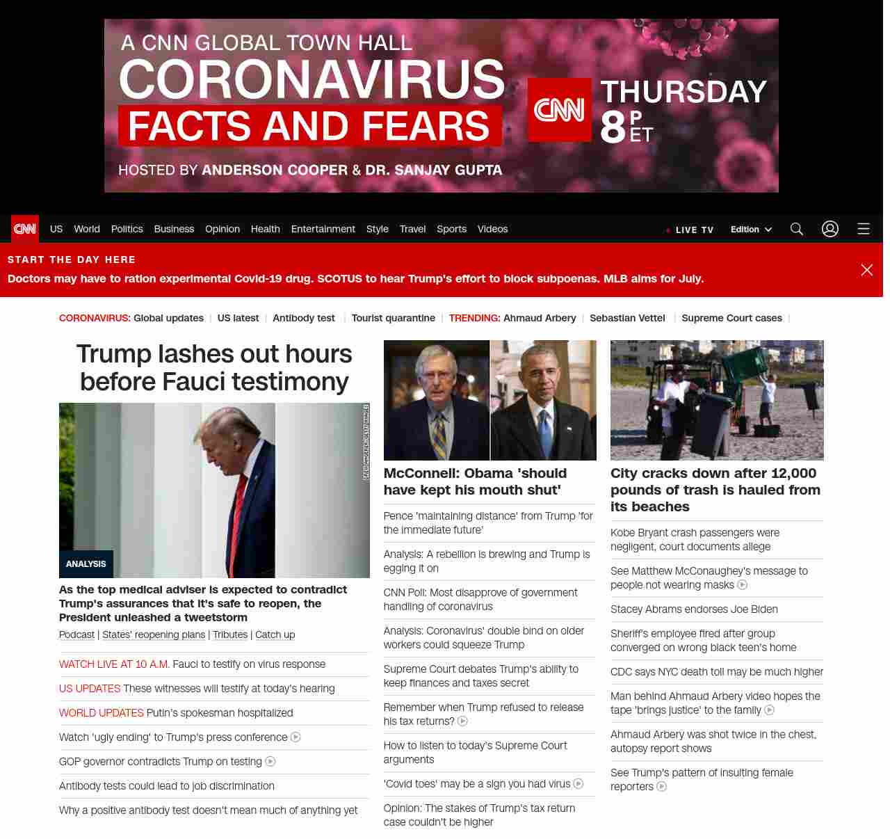 || screaming-banner-text banner-text-size–char-47″ data-analytics=”_list-hierarchical-xs_article_”> Trump lashes out hours before Fauci testimony ||” , title: “CNN – Breaking News, Latest News and Videos” , siblings: {“articleList”:[{“uri”:”/2020/05/12/politics/donald-trump-coronavirus-reelection/index.html”,”headline”:”u003cstrong>As the top medical adviser is expected to contradict Trump’s assurances that it’s safe to reopen, the President unleashed a tweetstormu003c/strong>”,”thumbnail”:”//cdn.cnn.com/cnnnext/dam/assets/200511170806-01-trump-testing-briefing-0511-small-11.jpg”,”duration”:””,”description”:”u003ca href=”https://www.cnn.com/audio/podcasts/corona-virus” target=”_blank”>Podcastu003c/a> | u003ca href=”https://www.cnn.com/interactive/2020/us/states-reopen-coronavirus-trnd/” target=”_blank”>States’ reopening plansu003c/a> | u003ca href=”https://www.cnn.com/interactive/2020/health/coronavirus-victims-memories/” target=”_blank”>Tributesu003c/a> | u003ca href=”https://www.cnn.com/2020/05/12/world/coronavirus-newsletter-05-12-20-intl/index.html” target=”_blank”>Catch upu003c/a>”,”layout”:””