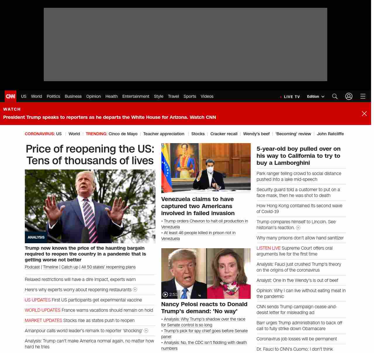 || screaming-banner-text banner-text-size–char-47″ data-analytics=”_list-hierarchical-xs_article_”> Price of reopening the US: Tens of thousands of lives ||” , title: “CNN – Breaking News, Latest News and Videos” , siblings: {“articleList”:[{“uri”:”/2020/05/05/politics/donald-trump-coronavirus-economy-models/index.html”,”headline”:”u003cstrong>Trump now knows the price of the haunting bargain required to reopen the country in a pandemic that is getting worse not betteru003c/strong>”,”thumbnail”:”//cdn.cnn.com/cnnnext/dam/assets/200505103005-01-trump-0505-small-11.jpg”,”duration”:””,”description”:”u003ca href=”https://www.cnn.com/audio/podcasts/corona-virus” target=”_blank”>Podcastu003c/a> | u003ca href=”https://www.cnn.com/interactive/2020/health/covid19-pandemic-video-timeline/index.html” target=”_blank”>Timelineu003c/a> | u003ca href=”https://www.cnn.com/2020/05/05/world/coronavirus-newsletter-05-05-20-intl/index.html” target=”_blank”>Catch upu003c/a> | u003ca href=”https://www.cnn.com/interactive/2020/us/states-reopen-coronavirus-trnd/” target=”_blank”>All 50 states’ reopening plansu003c/a>”,”layout”:””