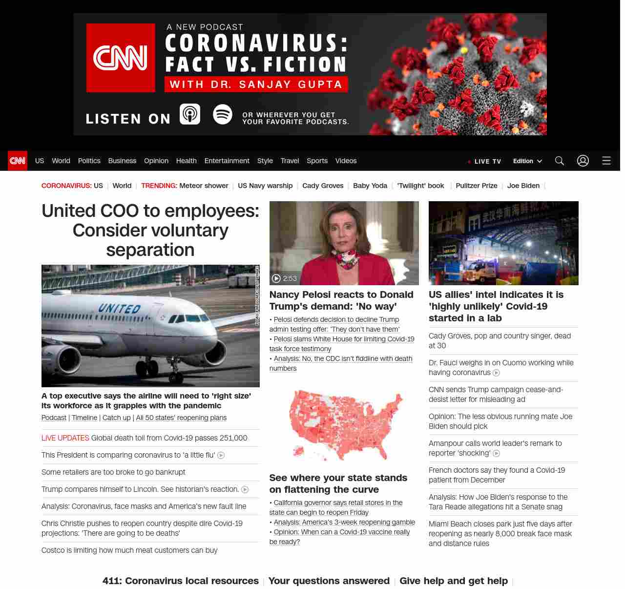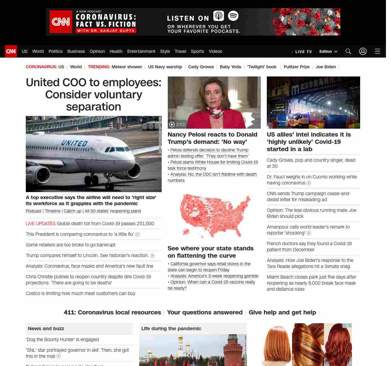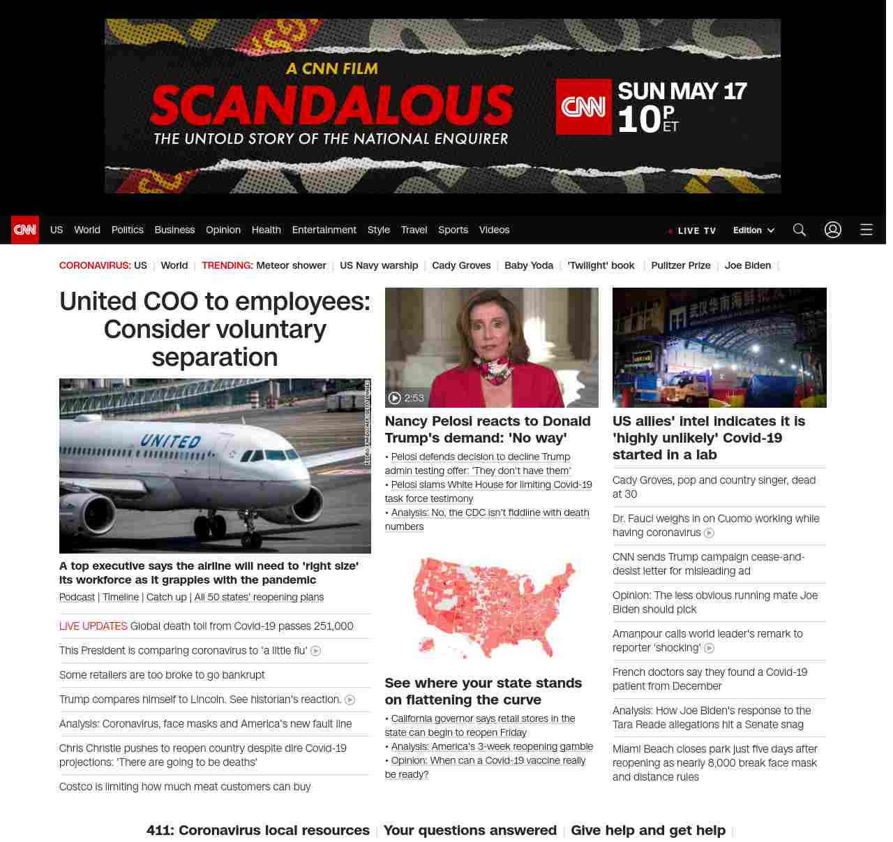 || screaming-banner-text banner-text-size–char-47″ data-analytics=”_list-hierarchical-xs_article_”> United COO to employees: Consider voluntary separation ||” , title: “CNN – Breaking News, Latest News and Videos” , siblings: {“articleList”:[{“uri”:”/2020/05/04/business/united-voluntary-separation/index.html”,”headline”:”u003cstrong>A top executive says the airline will need to ‘right size’ its workforce as it grapples with the u003c/strong>u003cstrong> pandemicu003c/strong>”,”thumbnail”:”//cdn.cnn.com/cnnnext/dam/assets/200504205708-united-airlines-0320-small-11.jpg”,”duration”:””,”description”:”u003ca href=”https://www.cnn.com/audio/podcasts/corona-virus” target=”_blank”>Podcastu003c/a> | u003ca href=”https://www.cnn.com/interactive/2020/health/covid19-pandemic-video-timeline/index.html” target=”_blank”>Timelineu003c/a> | u003ca href=”https://www.cnn.com/2020/05/04/world/coronavirus-newsletter-05-04-20-intl/index.html” target=”_blank”>Catch upu003c/a> | u003ca href=”https://www.cnn.com/interactive/2020/us/states-reopen-coronavirus-trnd/” target=”_blank”>All 50 states’ reopening plansu003c/a>”,”layout”:””