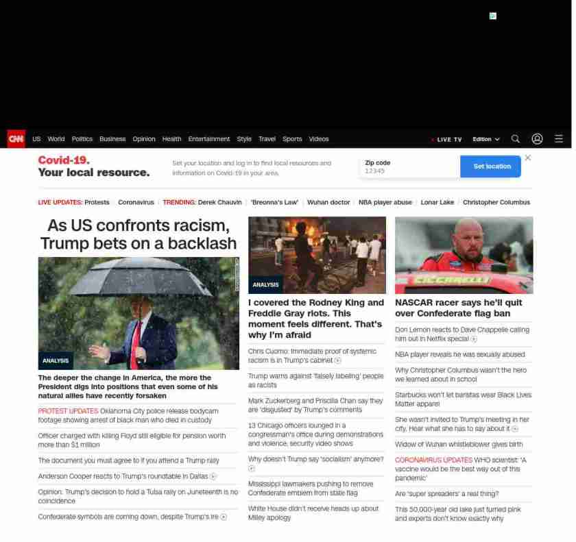 || screaming-banner-text banner-text-size–char-47″ data-analytics=”_list-hierarchical-xs_article_”> As US confronts racism, Trump bets on a backlash ||”},”chartbeat”:{“sections”:””},”branding_content_page”:”default”,”branding_content_zone”:[“default”],”branding_content_container”:[“default”,”cnn-money-markets”,”space-and-science”,”cnn-heroes-hp”],”branding_content_card”:[“”]} , edition: “domestic” , sourceId: ”