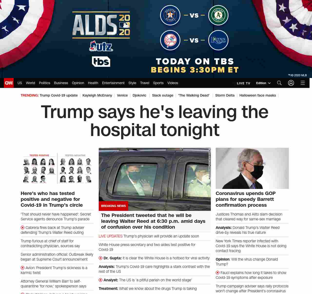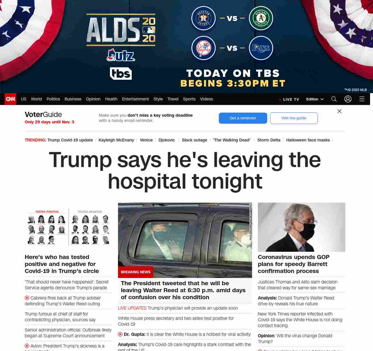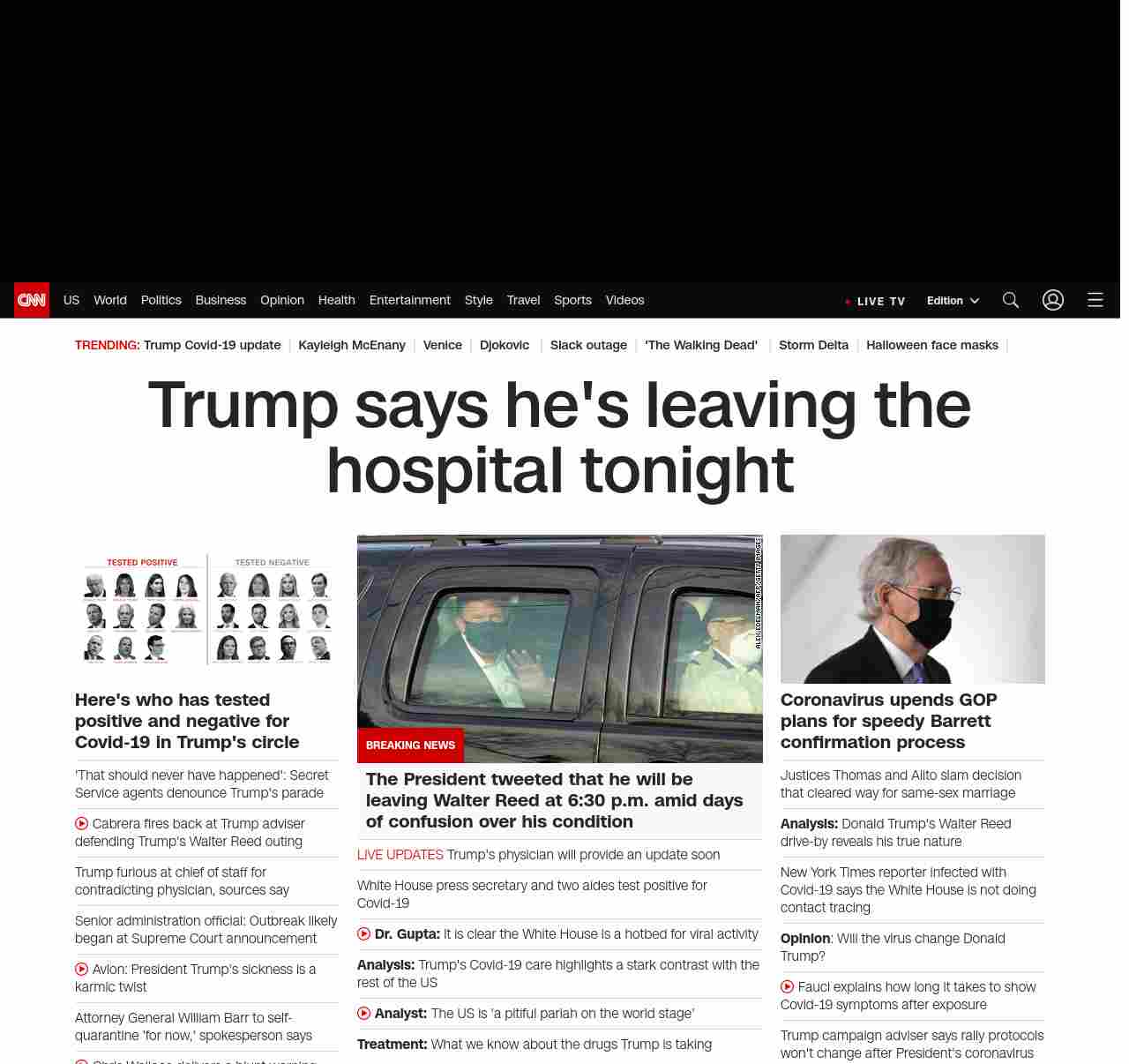 || banner-text–natural”> Trump says he’s leaving the hospital tonight ||”},”chartbeat”:{“sections”:””},”branding_content_page”:”default”,”branding_content_zone”:[“default”],”branding_content_container”:[“default”,”cnn-money-markets”,”space-and-science”,”champions-for-change”],”branding_content_card”:[“”]} , edition: “domestic” , sourceId: ”