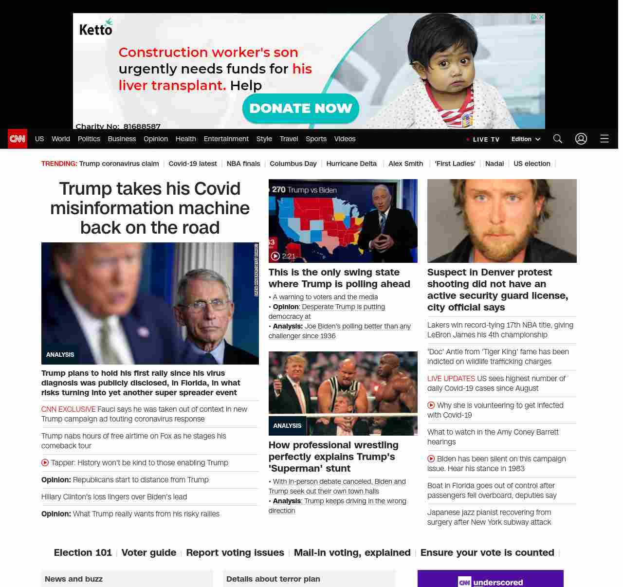 || screaming-banner-text banner-text-size–char-47″ data-analytics=”_list-hierarchical-xs_article_”> Trump takes his Covid misinformation machine back on the road ||Trump plans to hold his first rally since his virus diagnosis was publicly disclosed, in Florida, in what risks turning into yet another super spreader event