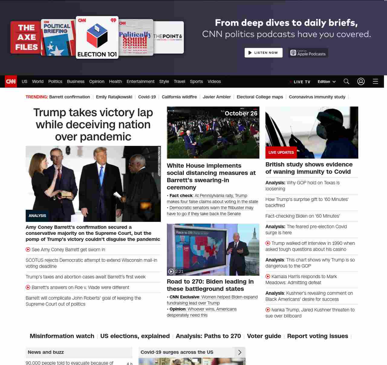 || screaming-banner-text banner-text-size–char-47″ data-analytics=”_list-hierarchical-xs_article_”> Trump takes victory lap while deceiving nation over pandemic ||Amy Coney Barrett’s confirmation secured a conservative majority on the Supreme Court, but the pomp of Trump’s victory couldn’t disguise the pandemic