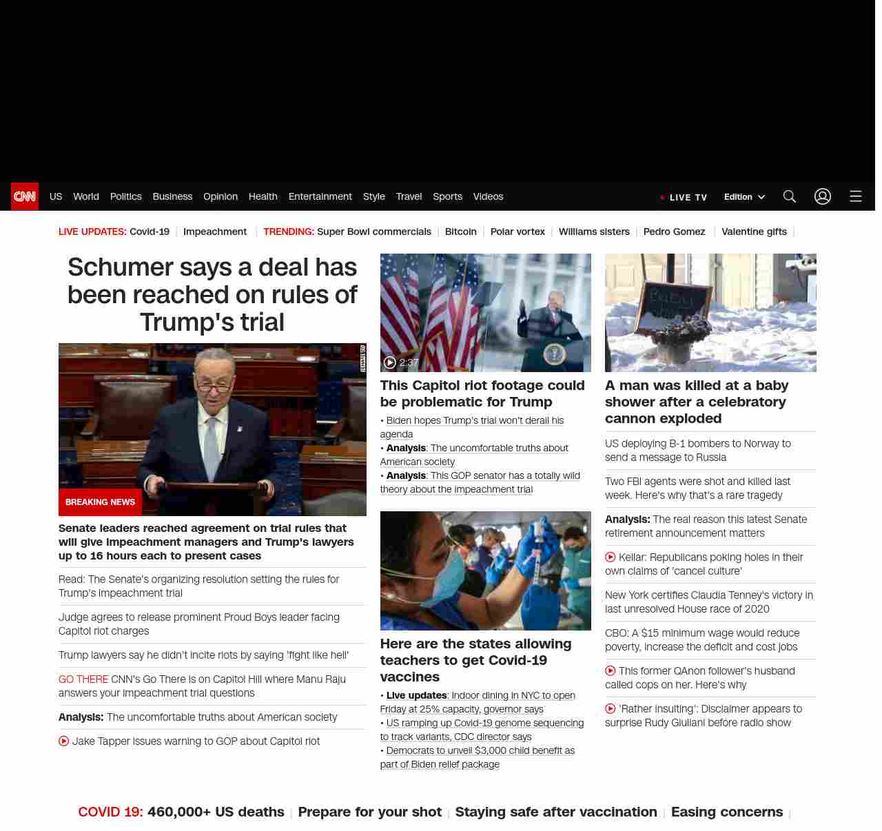 || Schumer says a deal has been reached on rules of Trump’s trial ||”},”chartbeat”:{“sections”:””},”branding_content_page”:”election-day”,”branding_content_zone”:[“default”],”branding_content_container”:[“default”,”cnn-money-markets”,”space-and-science”],”branding_content_card”:[“”]} , edition: “domestic” , sourceId: ”