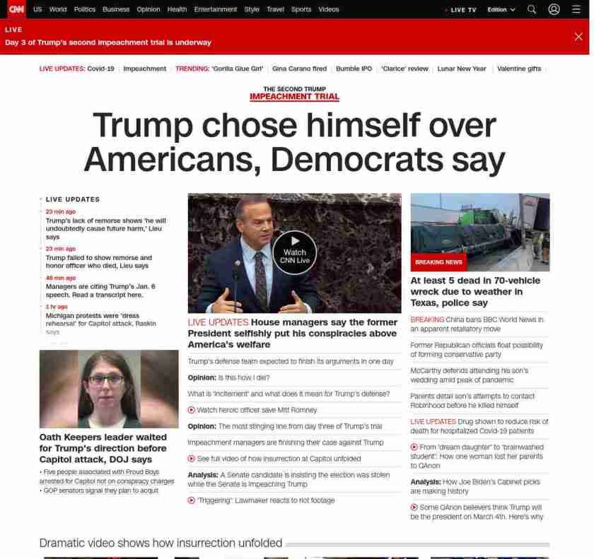 nprnews_____ = ||| lubuntu at wor3 2J1P|||House Managers Narrow In On Impact Of Capitol Violence||| kickerpage = |||no kicker pagenpr for NPRNEWS||| summarynpr = |||After arguing former President Donald Trump knowingly incited the Jan. 6 riot, the prosecutors are turning to the aftermath. Videos shown during the proceedings may contain profanity and violence.