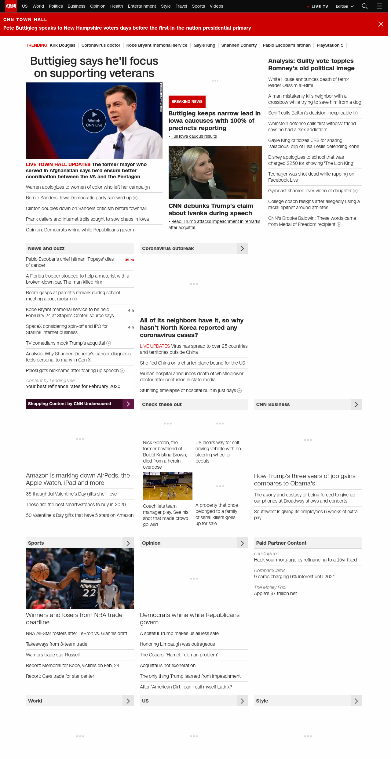 || Buttigieg says he’ll focus on supporting veterans ||” , title: “CNN – Breaking News, Latest News and Videos” , siblings: {“articleList”:[{“uri”:”/politics/live-news/cnn-02-06-20/index.html”,”headline”:”u003cstrong>The former mayor who served in Afghanistan says he’d ensure better coordination between the VA and the Pentagonu003c/strong>”,”thumbnail”:”//cdn.cnn.com/cnnnext/dam/assets/200206210734-02-buttigieg-town-hall-0206-small-11.jpg”,”duration”:””,”description”:”⢠u003ca href=”https://www.cnn.com/election/2020/state/iowa” target=”_blank”>Full Iowa caucuses resultsu003c/a>u003cbr />⢠u003ca href=”https://www.cnn.com/2020/02/06/politics/iowa-caucus-results/index.html” target=”_blank”>DNC chair calls for a recanvass in Iowau003c/a>u003cbr />â¢u003ca href=”https://www.cnn.com/2020/02/06/opinions/democratic-new-hampshire-primary-up-for-grabs-guild/index.html” target=”_blank”> Opinion: NH primary is still up for grabsu003c/a>u003cbr />⢠u003ca href=”https://www.cnn.com/2020/02/06/politics/iowa-caucus-prank-callers-chaos/index.html” target=”_blank”>Prank callers and internet trolls sought to sow chaos on Iowa caucus nightu003c/a>”,”layout”:””