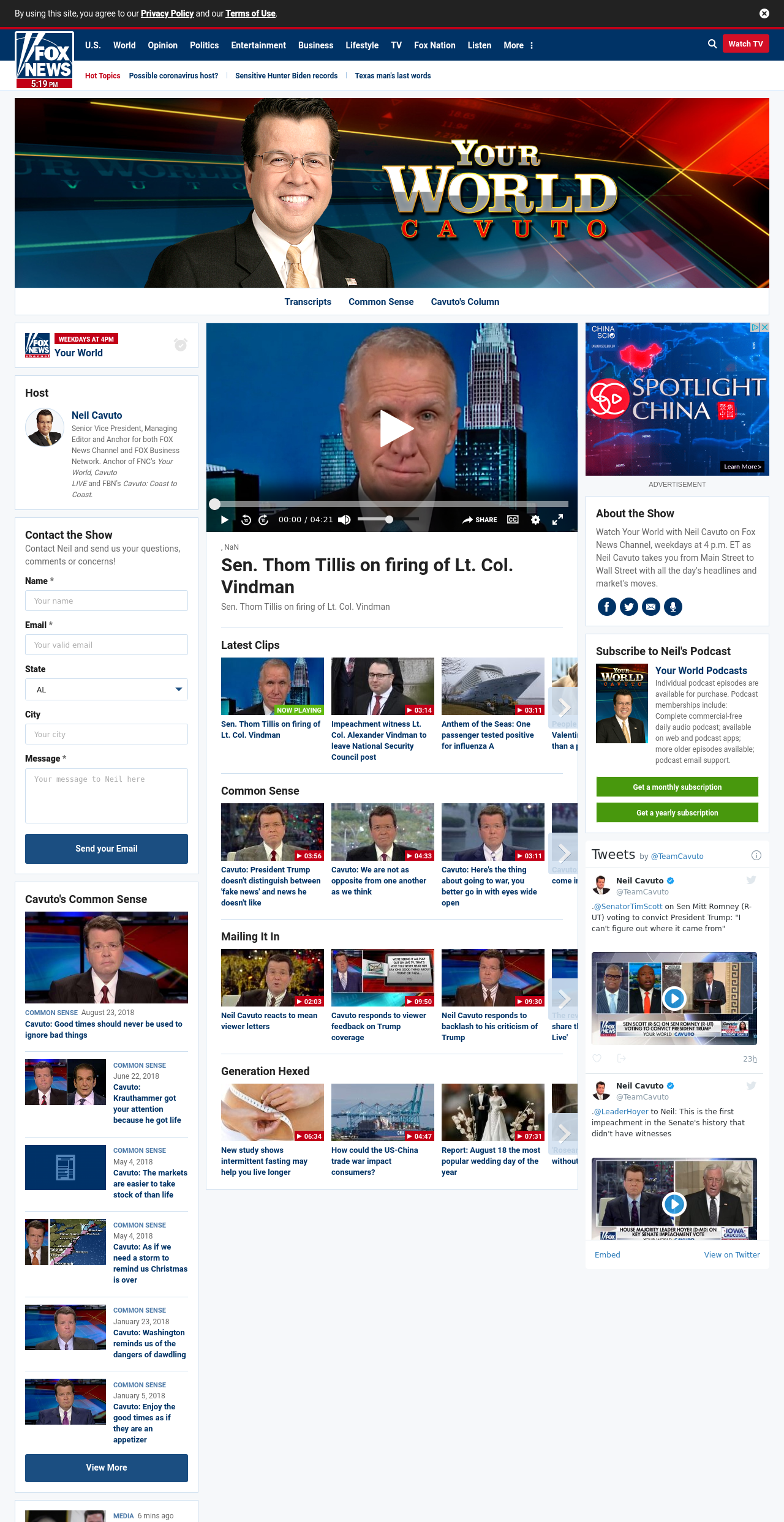 North Carolina Republican Senator Thom Tillis reacts to Lt. Col. Alexander Vindman being fired by the National Security Council and escorted off of the White House groups on âYour World with Neil Cavuto.â