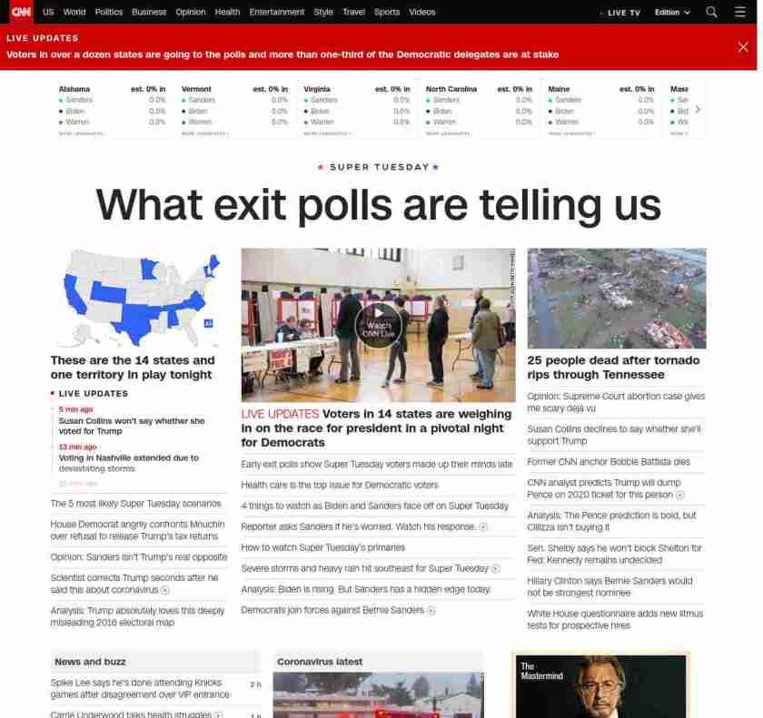 || banner-text–natural”> What exit polls are telling us ||” , title: “CNN – Breaking News, Latest News and Videos” , siblings: {“articleList”:[{“uri”:”/2020/03/03/politics/super-tuesday-bernie-sanders-joe-biden-michael-bloomberg/index.html”,”headline”:”The 5 most likely Super Tuesday scenarios”,”thumbnail”:”//cdn.cnn.com/cnnnext/dam/assets/200302165907-biden-bloomberg-sanders-warren-split-small-11.jpg”,”duration”:””,”description”:”A third of u003cem>allu003c/em> pledged delegates in the Democratic presidential race will be doled out on Tuesday u003ca href=”https://www.cnn.com/2020/03/03/politics/super-tuesday-polls-voting/index.html” target=”_blank”>across 14 statesu003c/a> — from California to Maine — in the single biggest day of the 2020 contest.”,”layout”:””