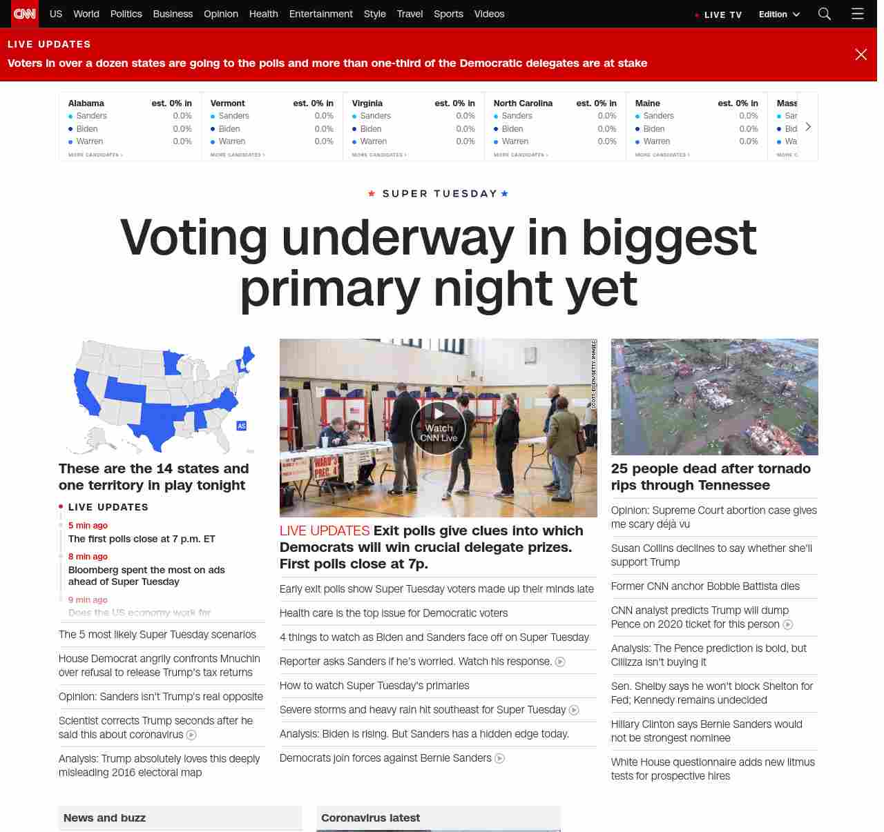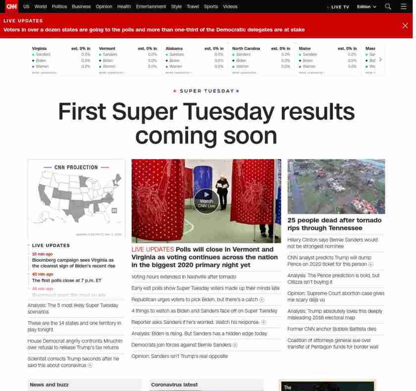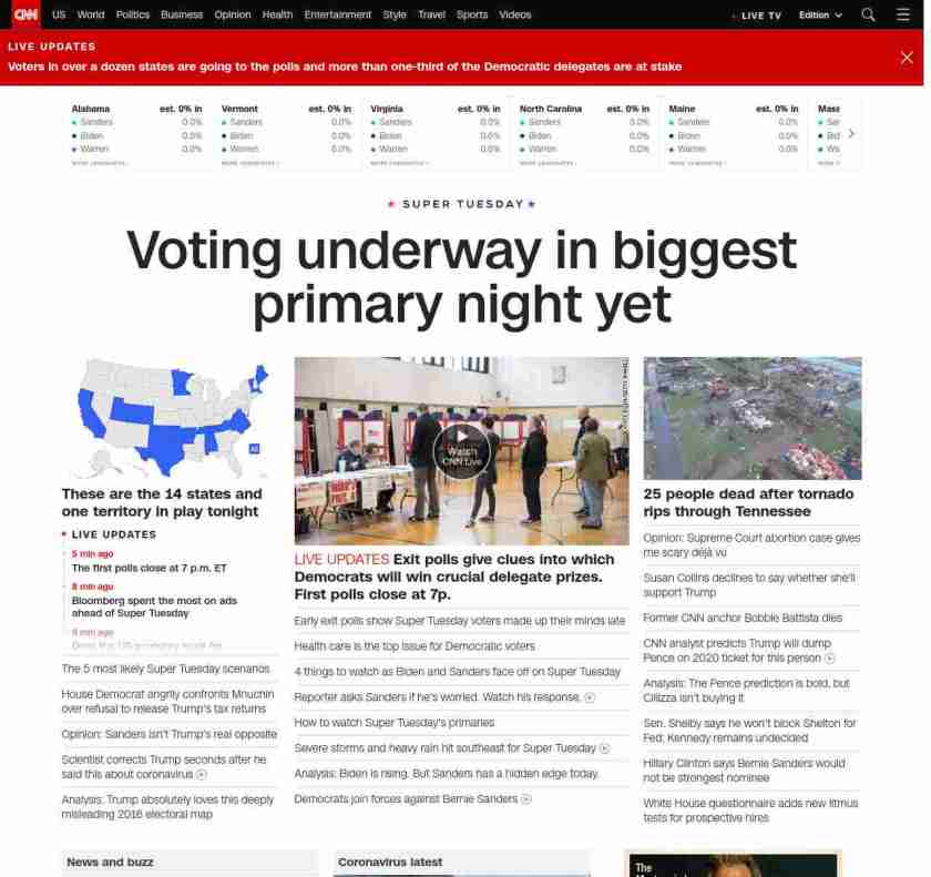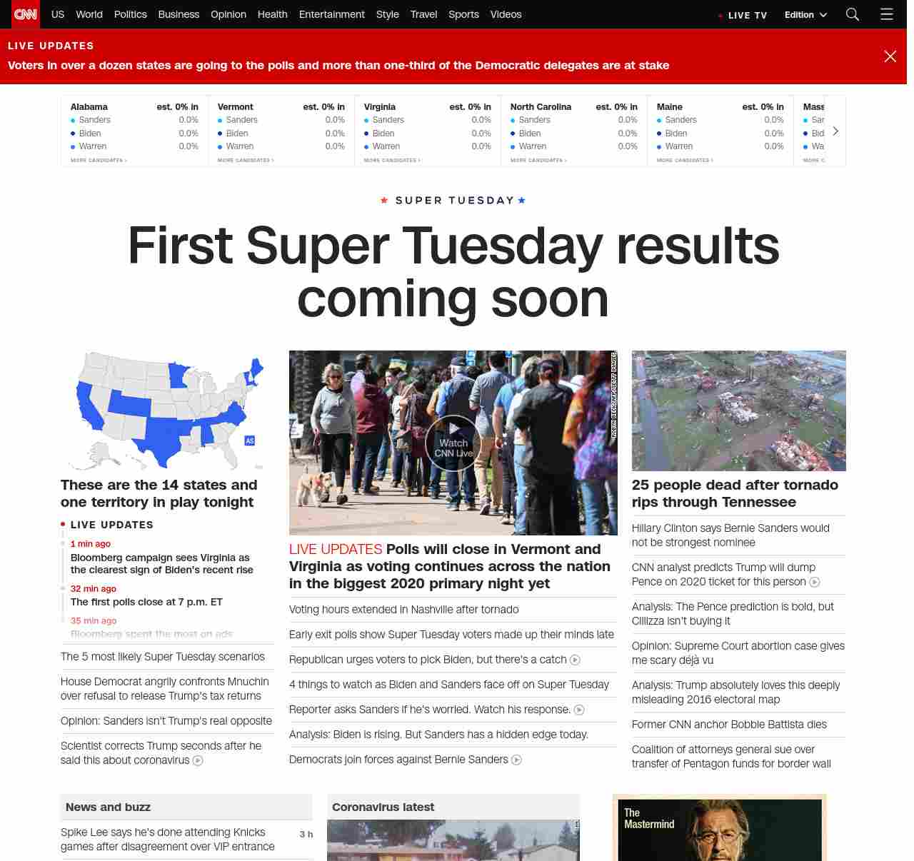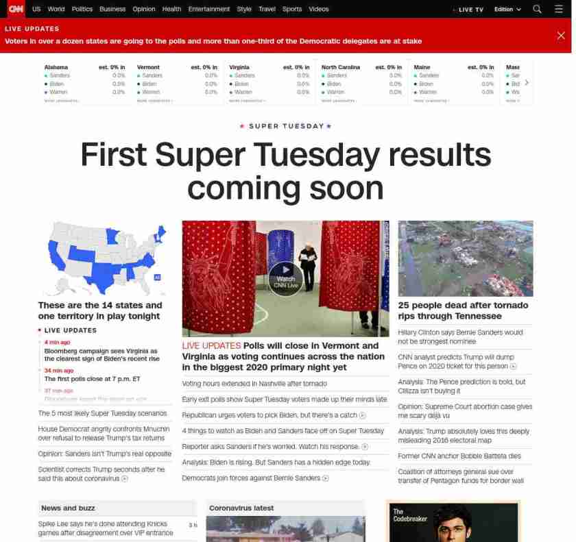 || banner-text–natural”> First Super Tuesday results coming soon ||” , title: “CNN – Breaking News, Latest News and Videos” , siblings: {“articleList”:[{“uri”:”/2020/03/03/politics/super-tuesday-bernie-sanders-joe-biden-michael-bloomberg/index.html”,”headline”:”Analysis: The 5 most likely Super Tuesday scenarios”,”thumbnail”:”//cdn.cnn.com/cnnnext/dam/assets/200302165907-biden-bloomberg-sanders-warren-split-small-11.jpg”,”duration”:””,”description”:”A third of u003cem>allu003c/em> pledged delegates in the Democratic presidential race will be doled out on Tuesday u003ca href=”https://www.cnn.com/2020/03/03/politics/super-tuesday-polls-voting/index.html” target=”_blank”>across 14 statesu003c/a> — from California to Maine — in the single biggest day of the 2020 contest.”,”layout”:””