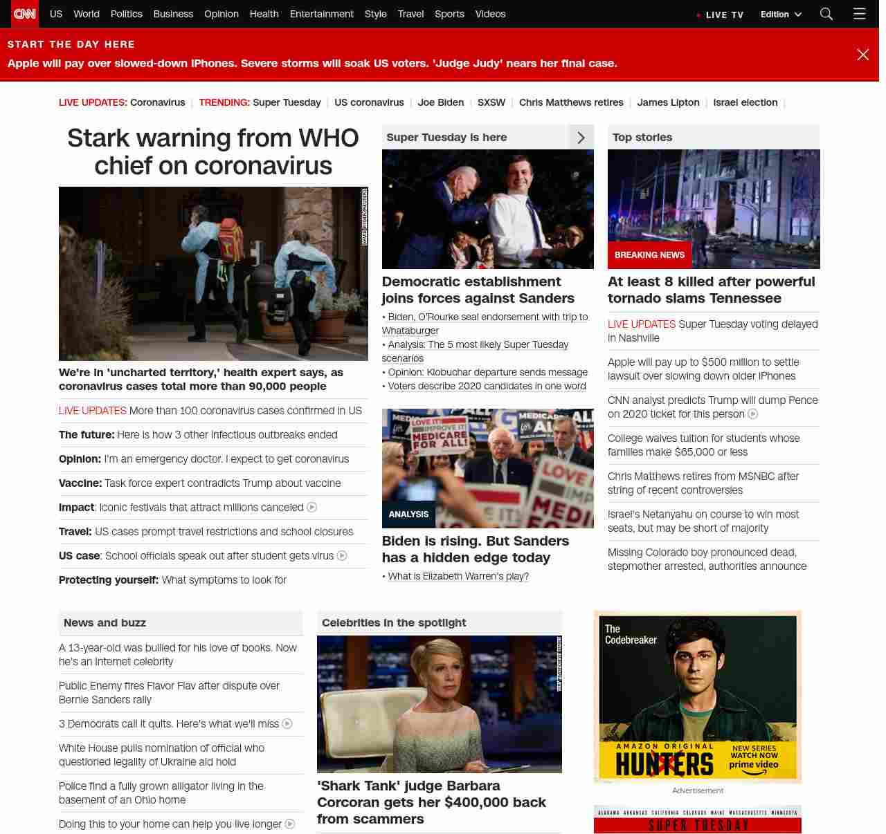 || screaming-banner-text banner-text-size–char-44″ data-analytics=”_list-hierarchical-xs_article_”> Stark warning from WHO chief on coronavirus ||” , title: “CNN – Breaking News, Latest News and Videos” , siblings: {“articleList”:[{“uri”:”/2020/03/03/asia/novel-coronavirus-covid-19-intl-hnk/index.html”,”headline”:”u003cstrong>We’re in ‘uncharted territory,’ health expert says, as coronavirus cases total more than 90,000 people u003c/strong>”,”thumbnail”:”//cdn.cnn.com/cnnnext/dam/assets/200302151908-06-coronavirus-0301-washington-small-11.jpg”,”duration”:””,”description”:”The head of the World Health Organization (WHO) said that public health officials are operating in “unchartered territory” as they combat the spread of the u003ca href=”https://www.cnn.com/specials/asia/coronavirus-outbreak-intl-hnk” target=”_blank”>novel coronavirusu003c/a>, which has infected more than 90,000 people u003ca href=”https://www.cnn.com/2020/01/29/asia/coronavirus-cases-worldwide-intl-hnk/index.html” target=”_blank”>across 73 countries and territoriesu003c/a> as of Monday evening.”,”layout”:””