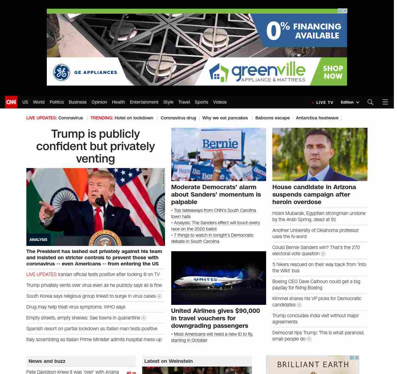|| screaming-banner-text banner-text-size–char-47″ data-analytics=”_list-hierarchical-xs_article_”> Trump is publicly confident but privately venting ||” , title: “CNN – Breaking News, Latest News and Videos” , siblings: {“articleList”:[{“uri”:”/2020/02/25/politics/coronavirus-us-donald-trump-washington-politics/index.html”,”headline”:”u003cstrong>The President’s frustration reflects a growing sense that the coronavirus outbreak will present a greater challenge than expectedu003c/strong>”,”thumbnail”:”//cdn.cnn.com/cnnnext/dam/assets/200225114934-11-trump-india-0225-roundtable-small-11.jpg”,”duration”:””,”description”:”Growing fears that the u003ca href=”https://www.cnn.com/2020/02/24/health/coronavirus-outbreak-pandemic-who-bn/index.html” target=”_blank”>coronavirus outbreak could turn into a pandemicu003c/a> and reach the United States are challenging President Donald Trump’s sunny assurances that everything is under control.”,”layout”:””