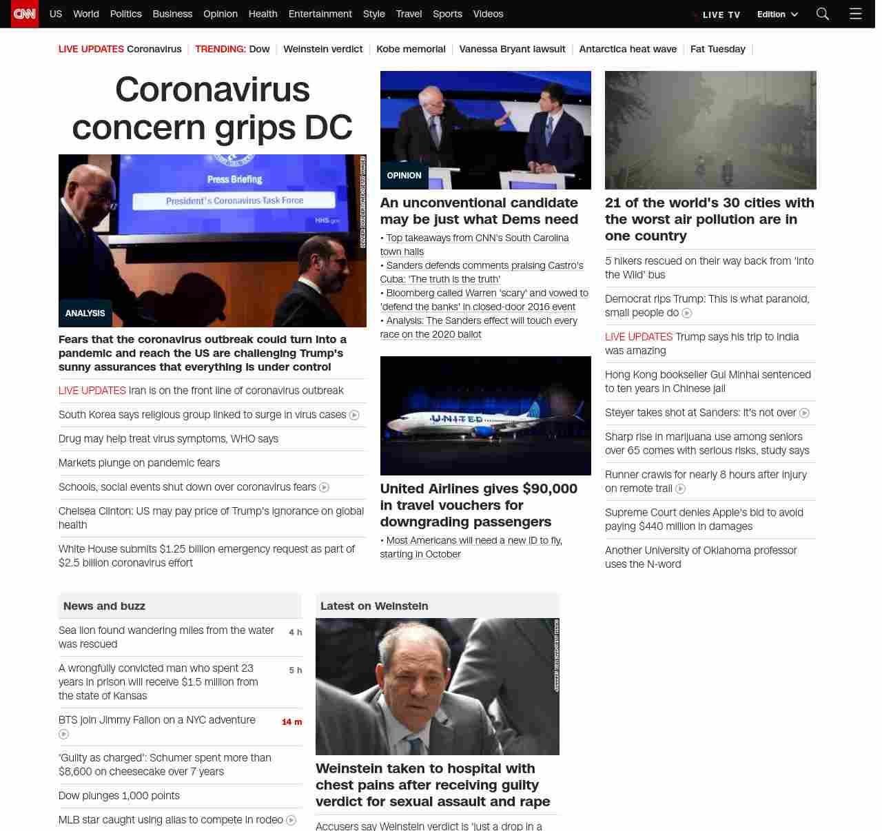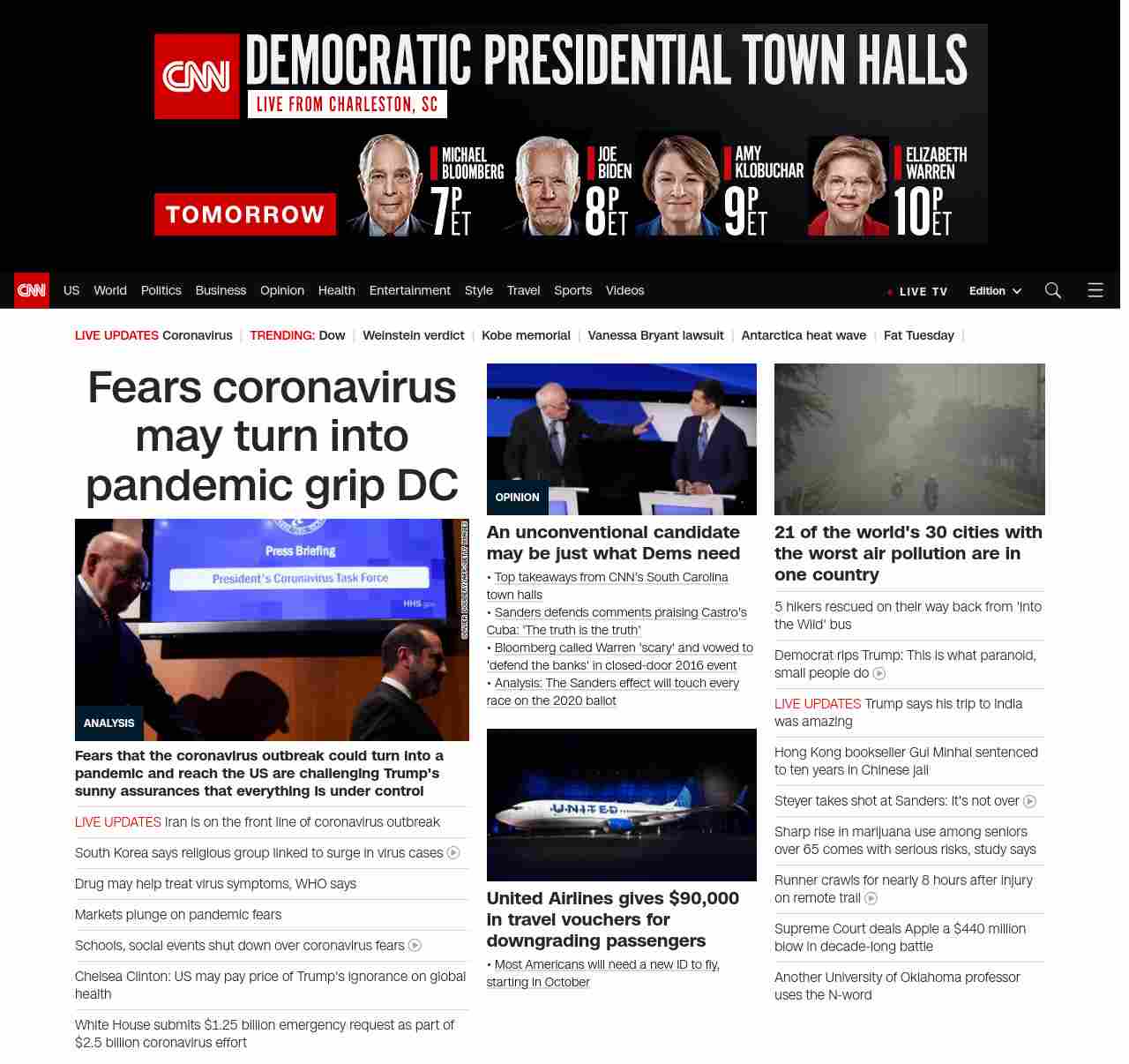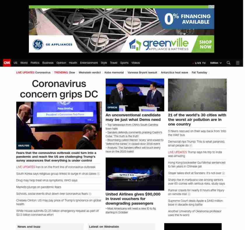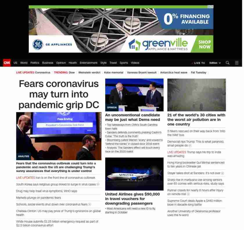 || screaming-banner-text banner-text-size–char-29″ data-analytics=”_list-hierarchical-xs_article_”> Coronavirus concern grips DC ||” , title: “CNN – Breaking News, Latest News and Videos” , siblings: {“articleList”:[{“uri”:”/2020/02/25/politics/coronavirus-us-donald-trump-washington-politics/index.html”,”headline”:”u003cstrong>Fears that the coronavirus outbreak could turn into a pandemic and reach the US are challenging Trump’s sunny assurances that everything is under controlu003c/strong>”,”thumbnail”:”//cdn.cnn.com/cnnnext/dam/assets/200224161723-coronavirus-briefing-0207-small-11.jpg”,”duration”:””,”description”:”Growing fears that the u003ca href=”https://www.cnn.com/2020/02/24/health/coronavirus-outbreak-pandemic-who-bn/index.html” target=”_blank”>coronavirus outbreak could turn into a pandemicu003c/a> and reach the United States are challenging President Donald Trump’s sunny assurances that everything is under control.”,”layout”:””