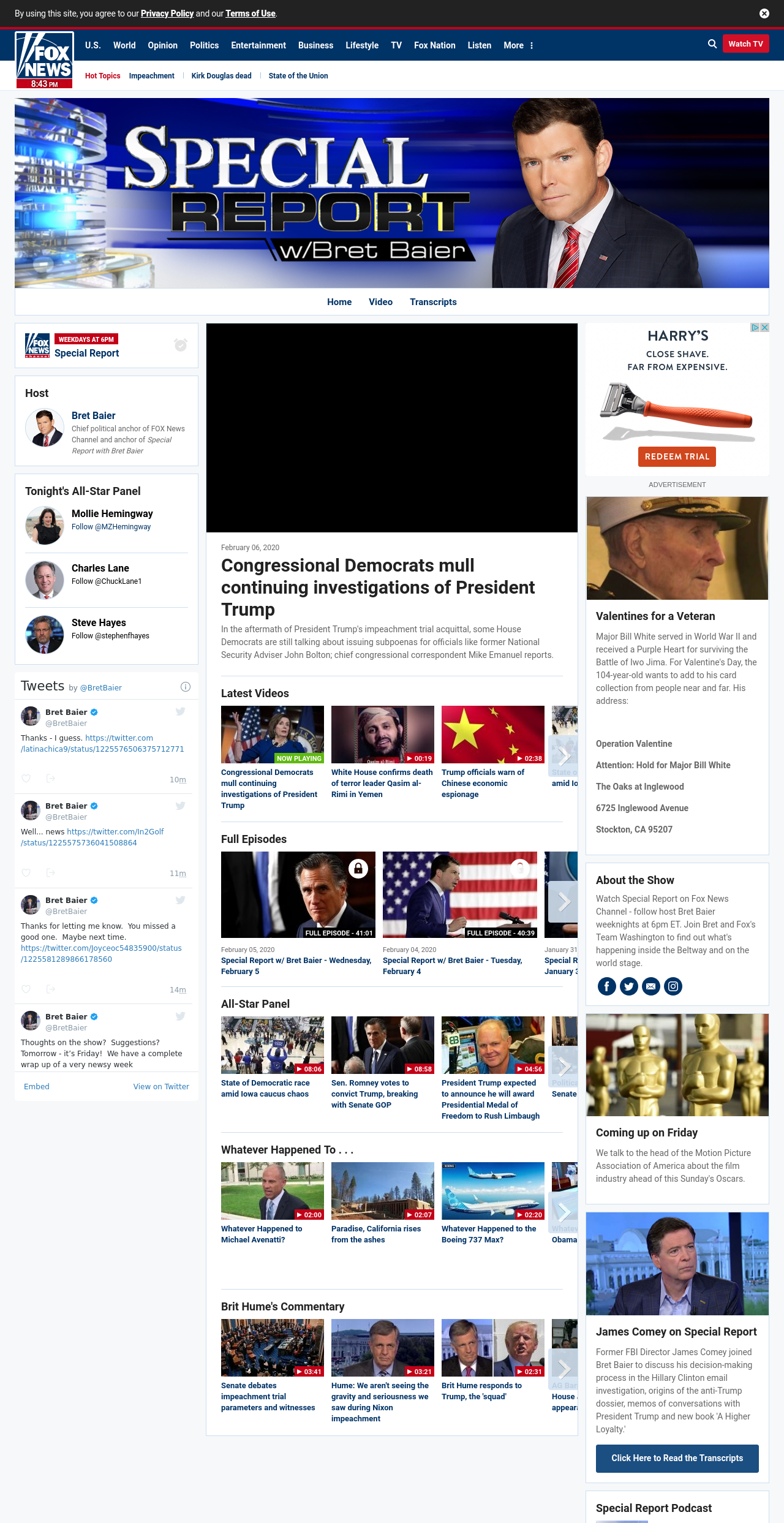 SR: Congressional Democrats mull continuing investigations of President Trump ((specialreportbaier)) ((lubuntu at wor3)) In the aftermath of President Trump’s impeachment trial acquittal, some House Democrats are still talking about issuing subpoenas for officials like former National Security Adviser John Bolton; chief congressional correspondent Mike Emanuel reports